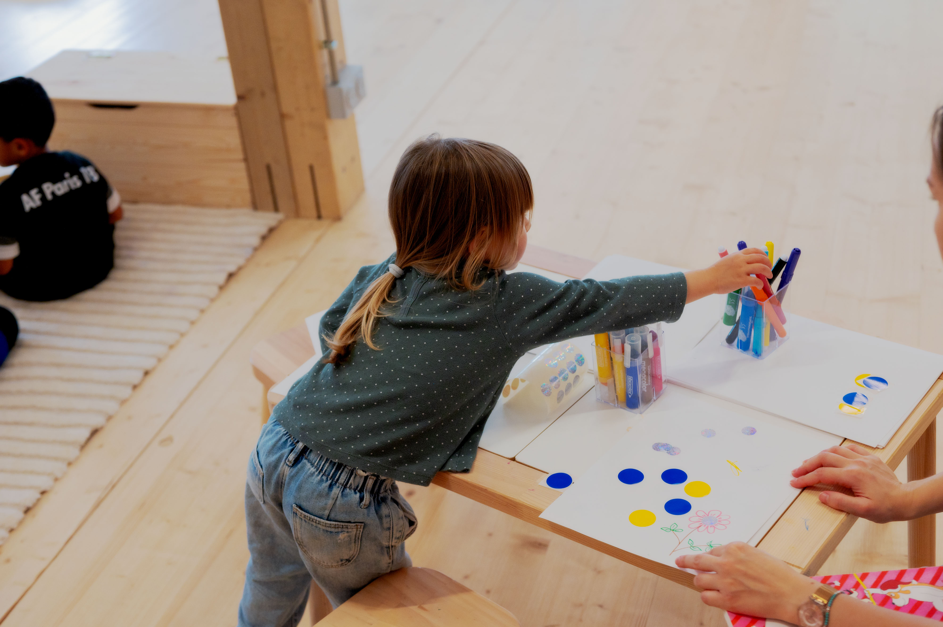 Deux accueillants ou accueillantes y proposent aux enfants, de la naissance à 5 ans révolus, accompagnés de leurs parents, un temps d’accueil gratuit, anonyme et sans inscription. Un moment privilégié pour jouer, dessiner, lire ou partager des instants de création plastique.