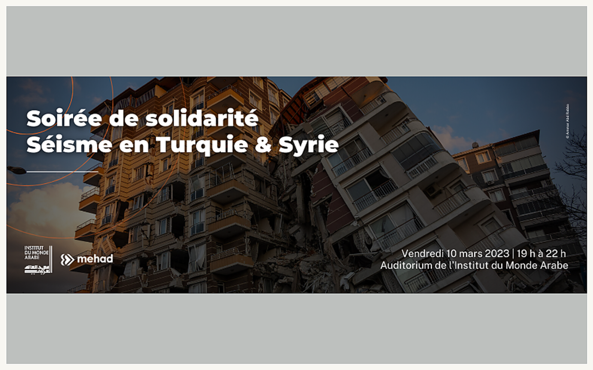 Le 6 février dernier, un violent séisme a dévasté le sud-est de la Turquie et la Syrie voisine. Il a fait plus de 50 000 mort, dont 6000 en Syrie, selon un bilan provisoire et en constante augmentation. Après un mois d’aide humanitaire d’urgence, les besoins sont toujours aussi importants. L’IMA et l’ONG Mehad vous invitent à cette soirée de soutien aux victimes qui réunira des soignants et secouristes de retour de Turquie et de Syrie et des artistes, journalistes et musiciens.