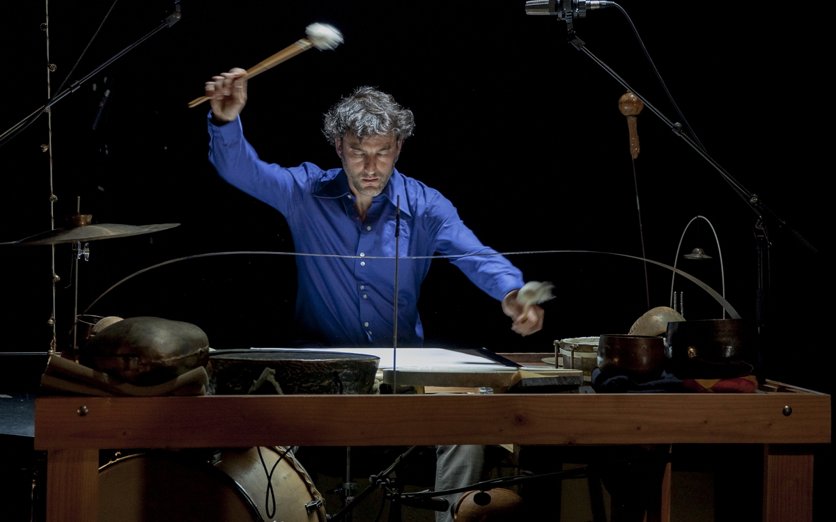 Sylvain Lemêtre, percussionniste un peu percuté, a conçu une table de percussions percussive devant laquelle il raconte une histoire de torture sonore, d’intestin flûte, des cheveux archets ou de claquettes électriques…