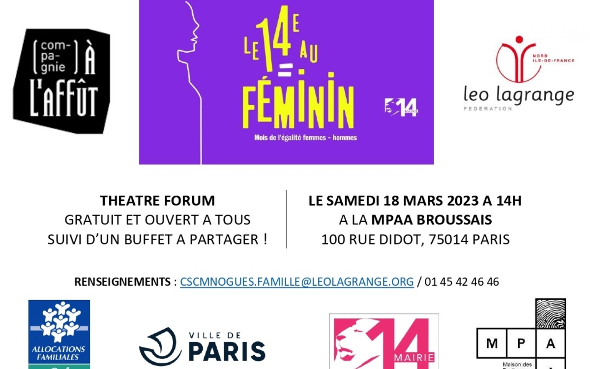 Théâtre forum sur le thème de l'égalité entre les femmes et les hommes, animé par la compagnie A l'affût et préparé avec des publics du centre socioculturel Maurice Noguès.