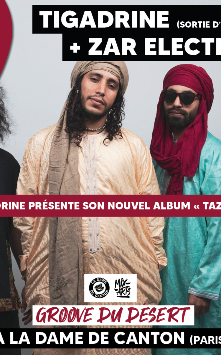 Tigadrine s’est formé en 2020 à Grenoble. C’est avant tout un groove, une énergie, une musique avec une sonorité éclectique distinctive fusionnant la musique ancestrale de Oued Noun, le blues du désert et d’autres influences rock, funk, reggae. Le chant est en langue Hassani (langue tribale du désert), Berbère et dialecte marocain.