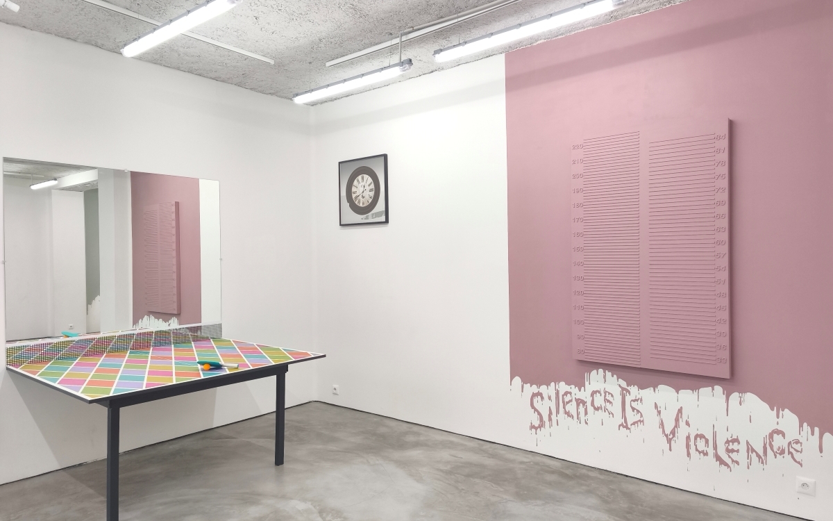Offrant une parenthèse ludique, Win, Win présente une table de ping-pong coupée en deux, montée contre un miroir qui complète la forme par reflet. Le spectateur joue seul, sans autre objectif qu’une contemplation compétitive. La surface à motif arlequin évoque l’esprit et ses limites, teintés de mélancolie, en écho à la figure du trickster du folklore français.