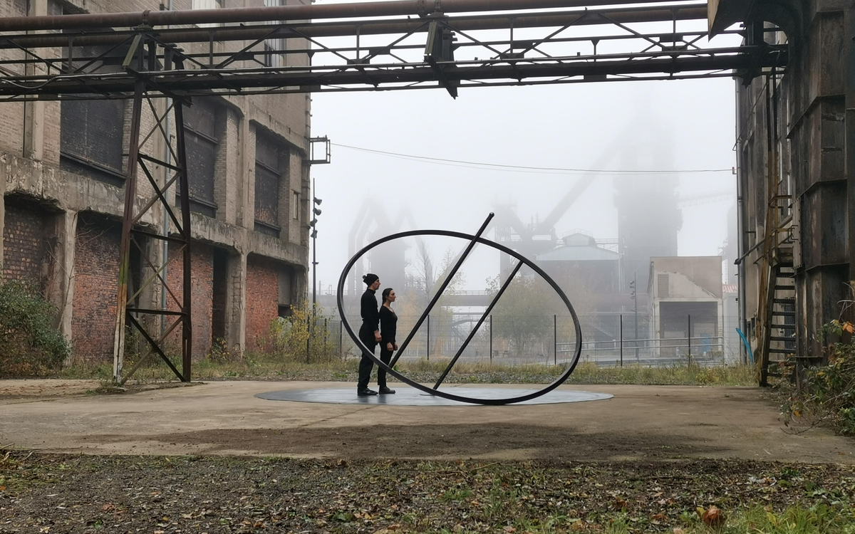 Une sculpture mobile géante évolue dans l’espace public, comme une toupie échouée ou un volume vide, abandonné à sa trajectoire circulaire. Une fois mise en mouvement, deux funambules marchent sur ce double chemin étroit, concave et convexe, générant des mouvements inattendus ou l’élégance et la poésie rencontrent le contrôle et l’habileté.