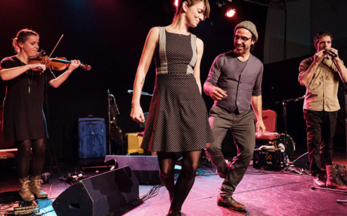 A ses côtés, la « calleuse » Yaëlle Azoulay guidera chacun dans l’apprentissage du set carré, de la contredanse ou du quadrille. La « calleuse » (de « call » en anglais), c’est en effet celle qui mène la danse, avec la complicité joyeuse des musiciens mêlant ici guitare, banjo, violon, harmonica, guimbarde et ukulélé. Percussions corporelles, leurs mains et leurs pieds seront aussi de la fête pour soutenir le rythme et entraîner veilleur débutant ou initié dans la joie mouvementée qui gagne toujours tous les participants.