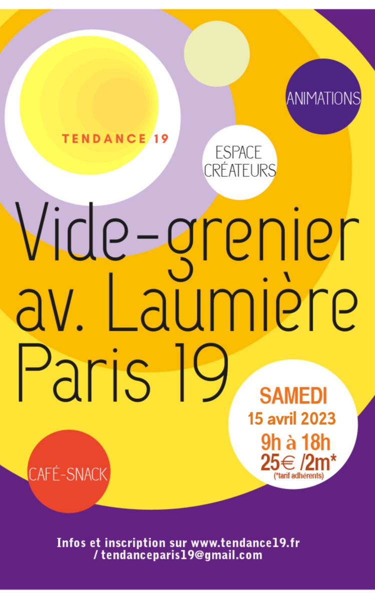 Samedi 15 avril, rendez-vous avenue Laumière de 9h à 18h. De l'avenue Jean Jaurès aux Buttes-Chaumont vous pourrez chiner les trésors des habitants du 19ème et d'ailleurs, découvrir des créations locales originales et variées, flâner et pourquoi pas partager un moment conviviale sur notre sur notre stand buvette et petite restauration sucrée et salée !