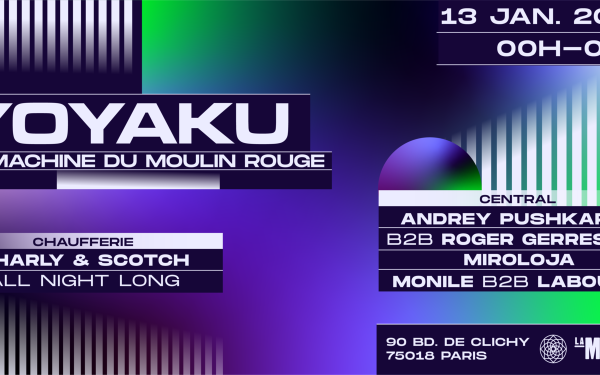 Yoyaku est de retour à La Machine du Moulin Rougele vendredi 13 janvier ! Cette fois, on invite deux artistes emblématiques de la scène électronique : Andrey PUSHKAREV et Roger Gerressen pour un B2B qu’on attends avec impatience ! Pour les accompagner, on a fait appel à nos Parisien.ne.s préféré.e.s : le duo Miroloja qu’on ne présente plus, ainsi que Monile et Labouts en B2B. La Chaufferie ne sera pas en reste avec Charly & Scotch all night long! On a hâte