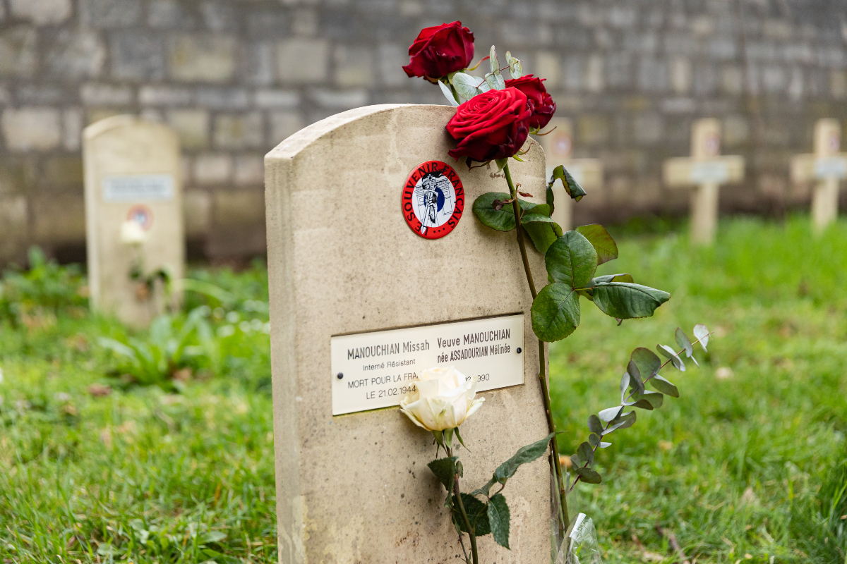 Dépôt de gerbes pour les membres du groupe Manouchian, dans le cimetière d’Ivry-sur-Seine (Val-de-Marne).