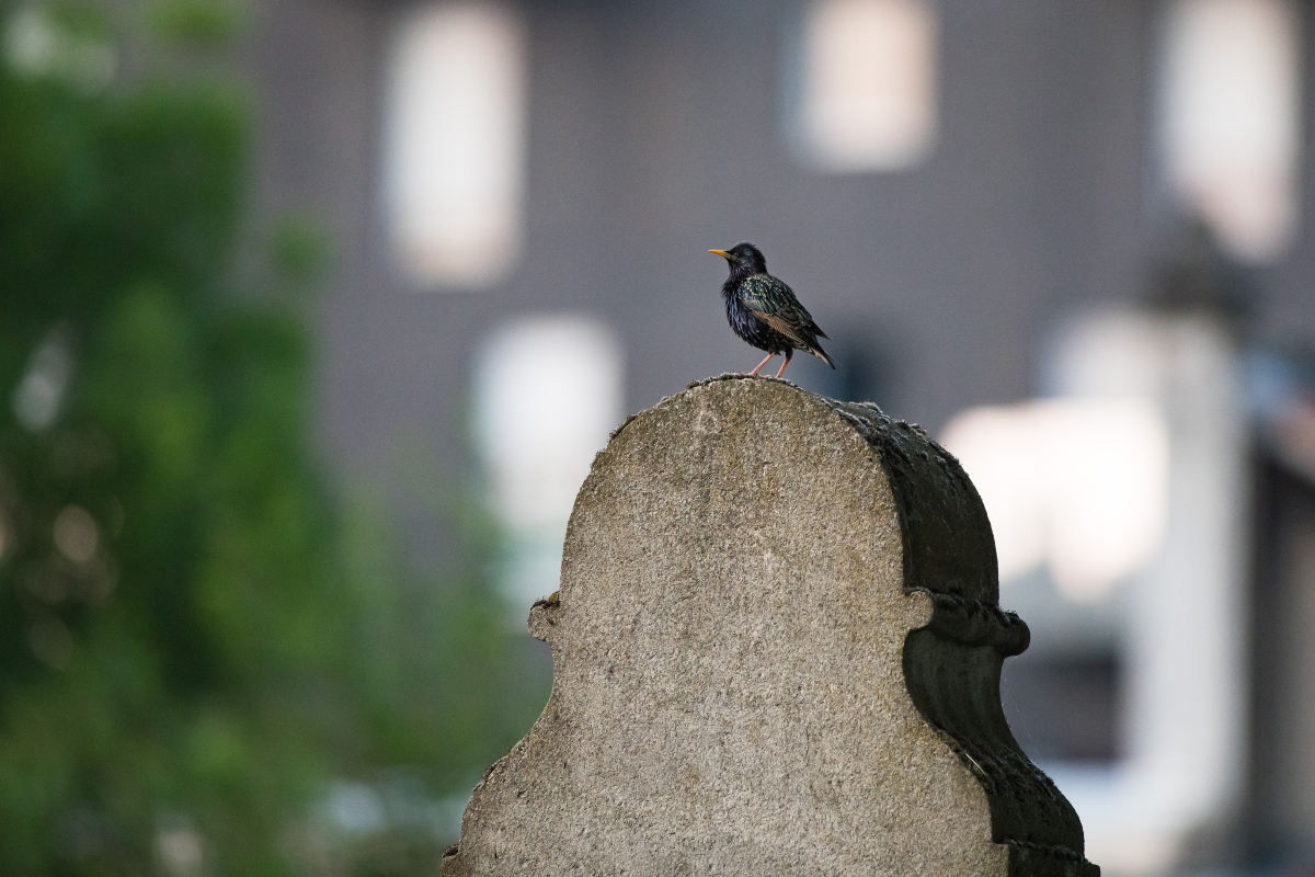 Un étourneau sansonnet sur une sépulture du cimetière d’Ivry-sur-Seine (Val-de-Marne).