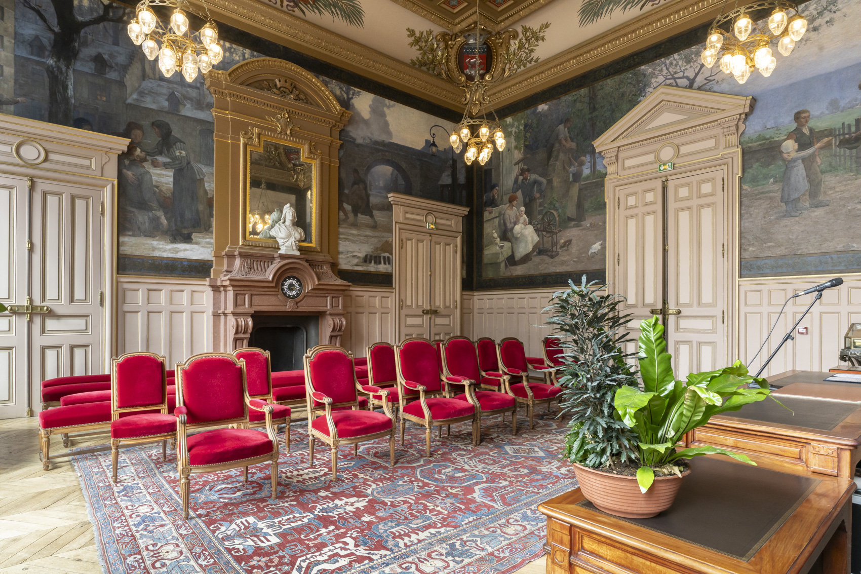 La salle des mariages lambrissée a été dessinée en 1886 par Ferdinand Humbert et Pierre Lagarde, qui ont réalisé les motifs allégoriques sur le plafond.