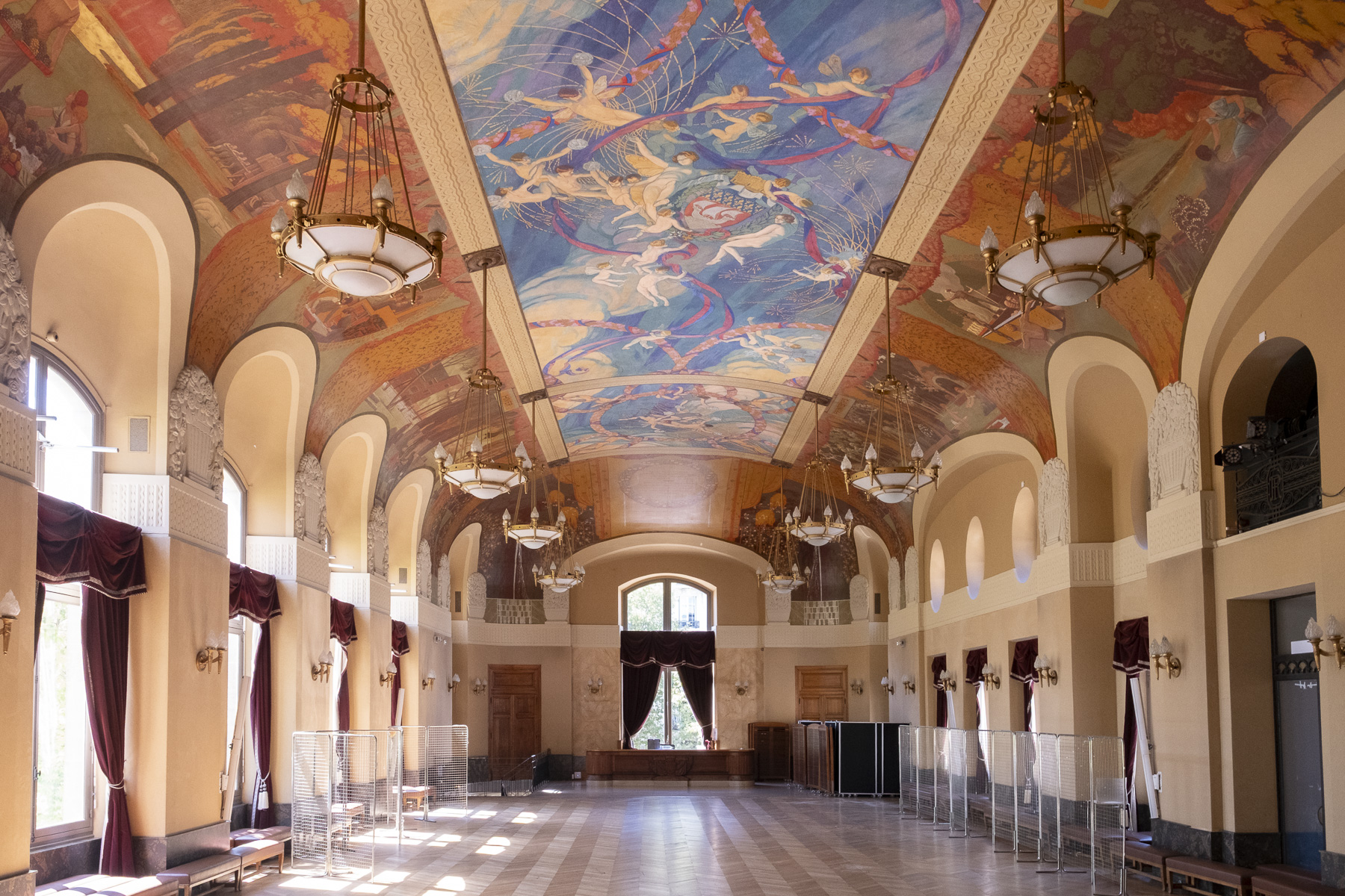 À l'intérieur, la décoration de la salle des Fêtes, signée du peintre-décorateur Henri Rapin (1873- 1939) et réalisée lors de l'agrandissement des lieux entre 1924 et 1929, est une merveille. D'une esthétique Art déco, le décor est inspiré des quatre saisons et comprend des sculptures décoratives, stuc en faux marbre, mobilier, lustres et imposante vue de Paris. Le plafond peint par Octave Denis Victor Guillonet (1872 - 1967) représente des personnages dénudés virevoltant sur fond de ciel bleu autour des armoiries de Paris. Osé, mais superbe !