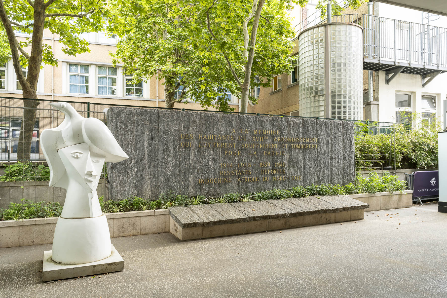 Une statue de Paul Flickinger représentant une colombe de la paix est installée devant le monument aux morts, dans la cour arrière de la mairie du 17e arrondissement.