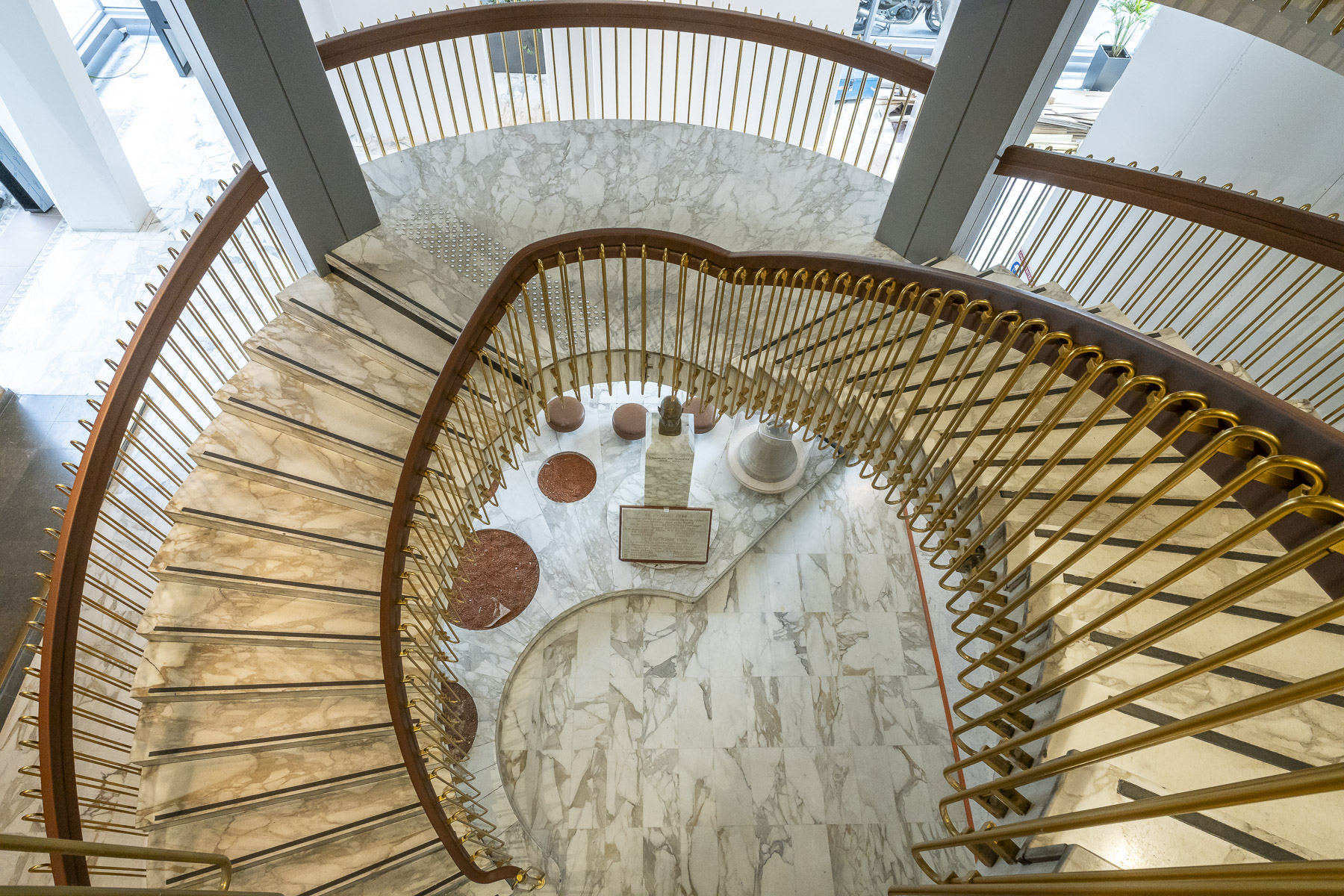 L’escalier d’honneur : du marbre pour le côté classique, une rampe en bronze pour l’aspect novateur et une main courante recouverte de cuir pour le confort – la marque du décorateur Raphaël (1912-2000).