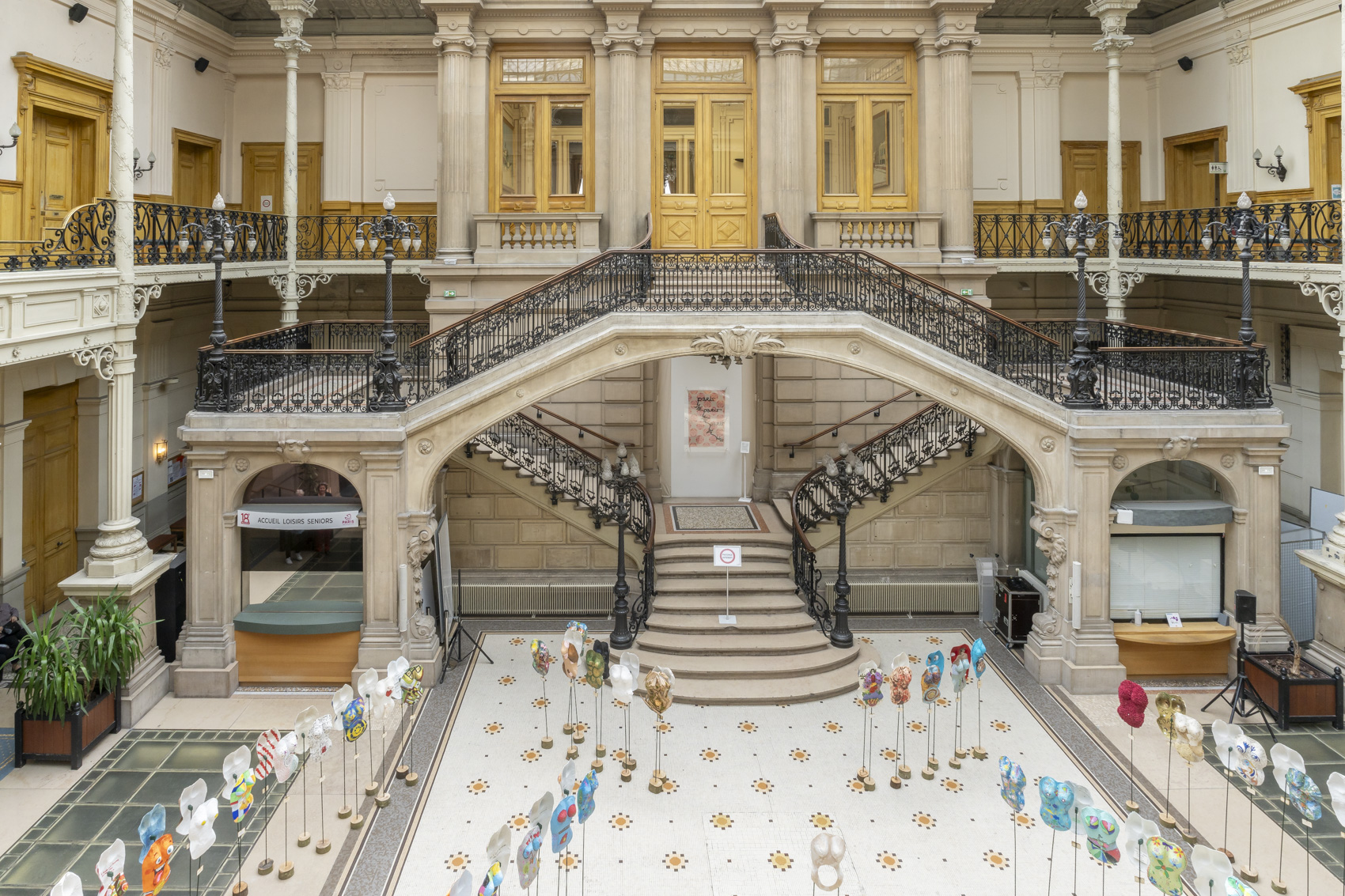 Le hall, telle une deuxième façade. Il sert parfois de lieu d'exposition, comme ici avec l'installation « La femme », réalisée par les artistes de la place du Tertre (avril 2025).