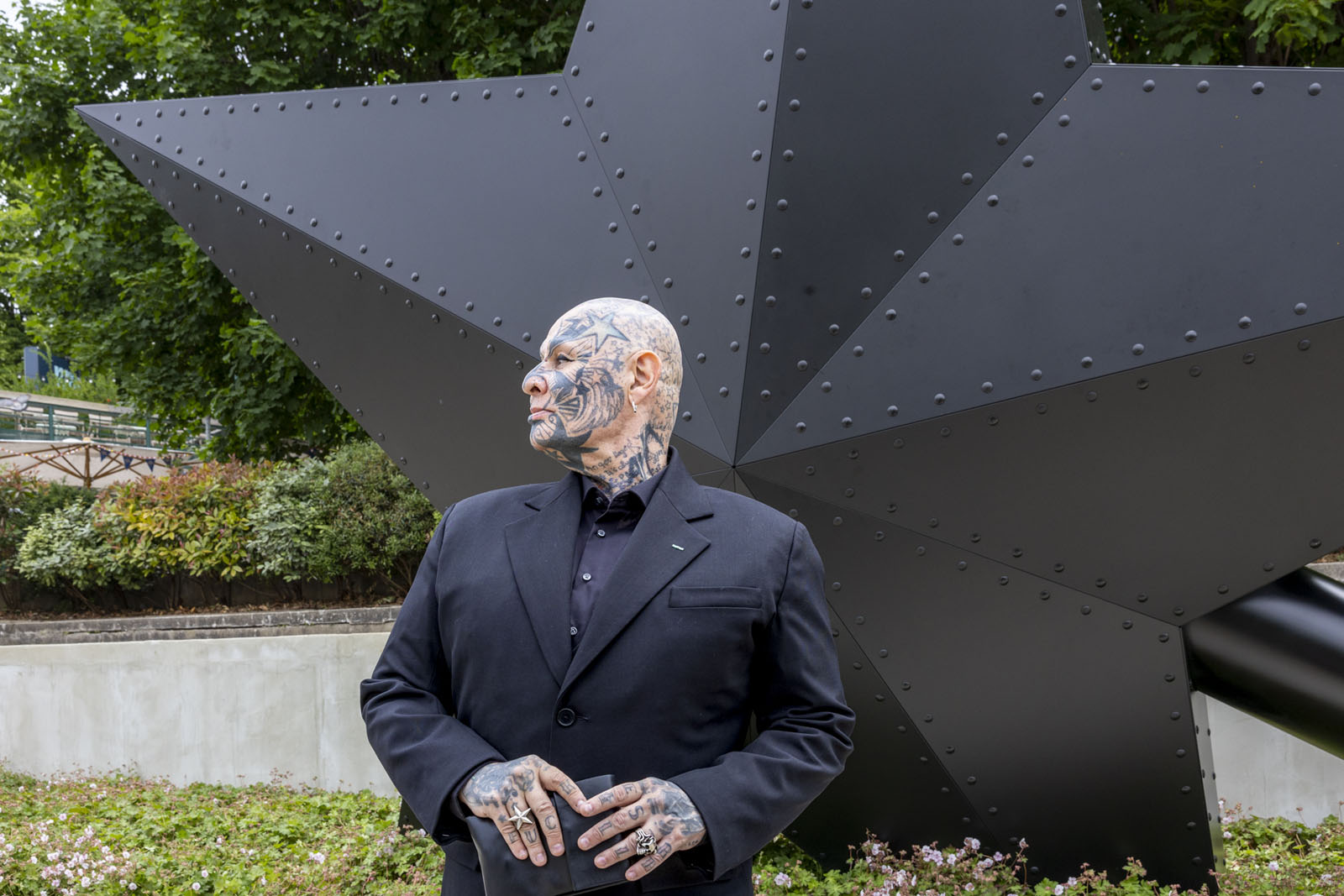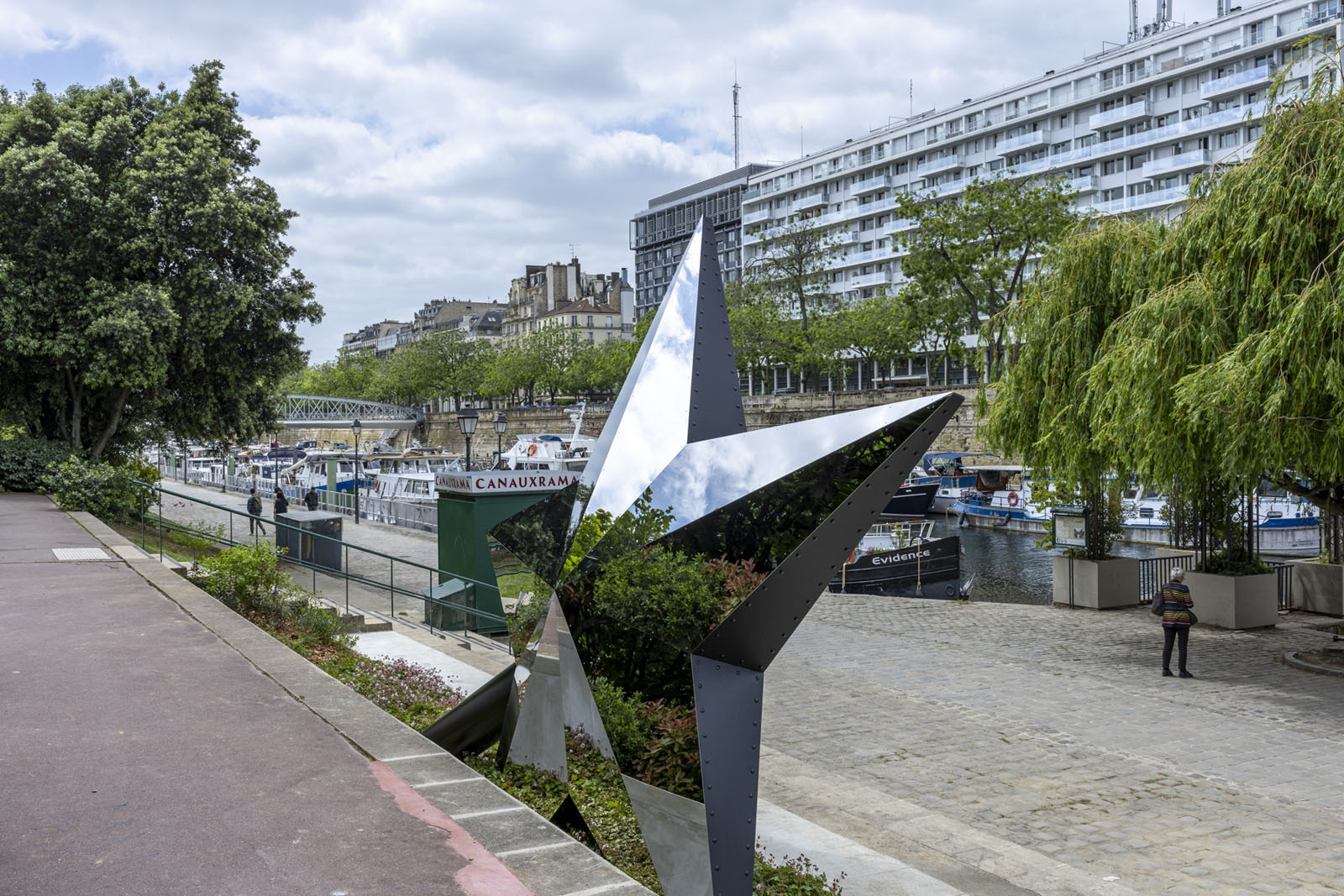 Pour Aux oubliées et oubliés !, une sculpture conçue comme un devoir de mémoire, il a choisi une baguette étoilée à deux faces en acier : « Le côté noir mat évoque les heures sombres de l’histoire, tandis que le côté poli miroir reflète la lumière et les couleurs du temps qui passe, précise l’artiste. L’œuvre est penchée vers