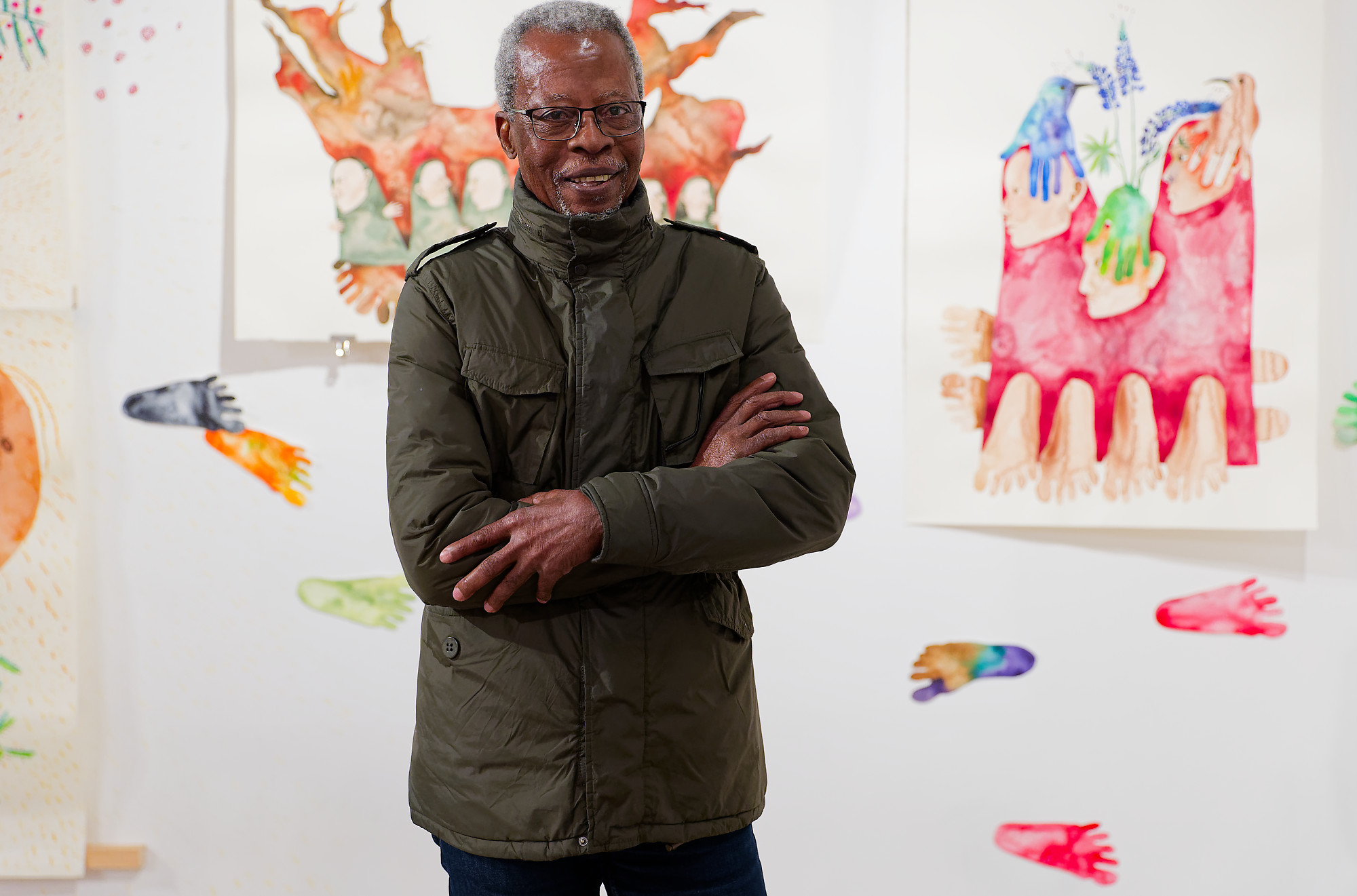 Aziz, usager de l’Institut des cultures d’islam (18e), visite l’expo « Those Who Walk the Land », de Sabreen Haj Ahmad, avec l’association Ayyem Zamen.