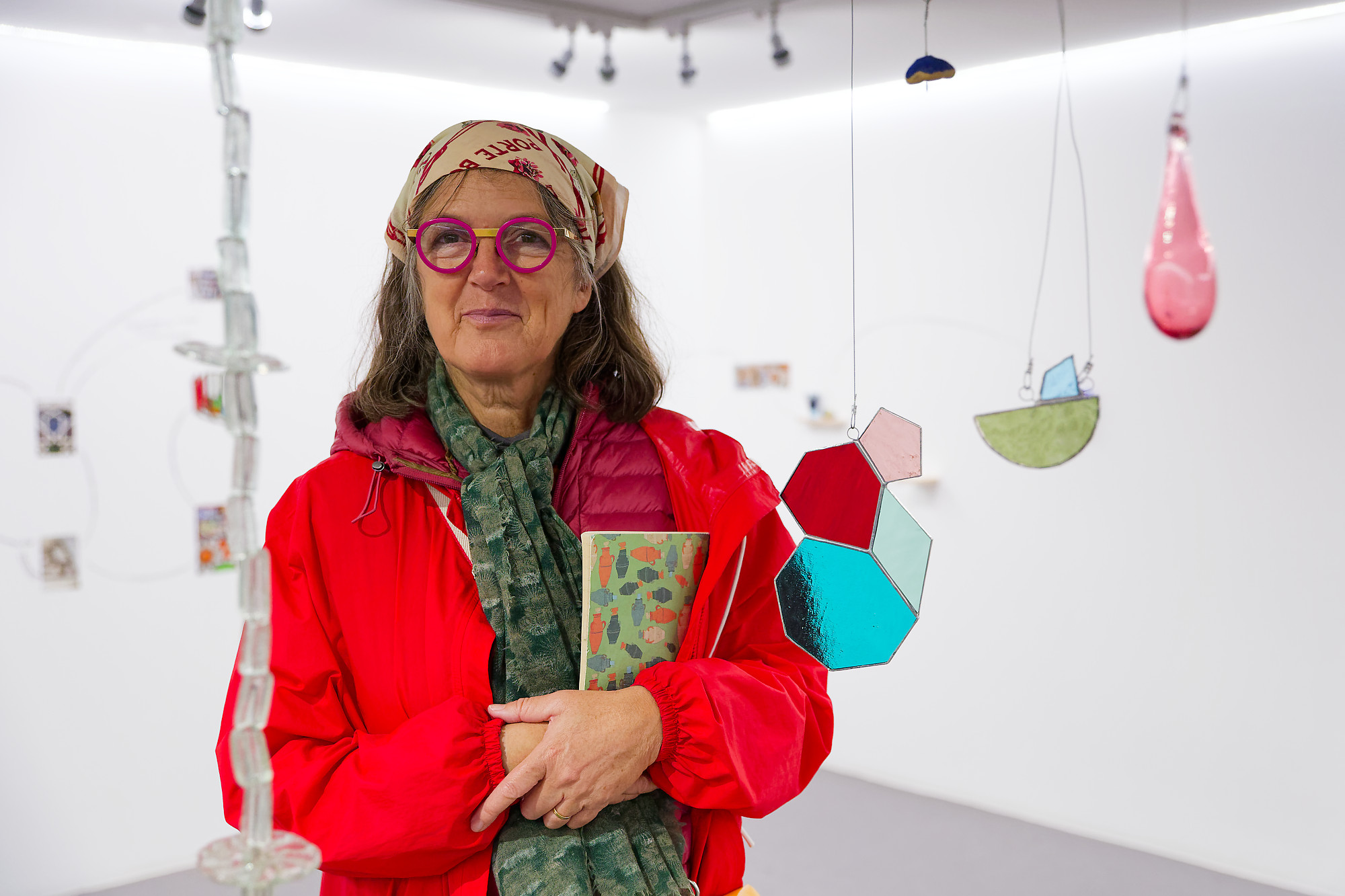 Frédérique, au milieu des œuvres de Sara Ouhaddou, exposée à l’Institut des cultures d’islam (18e).