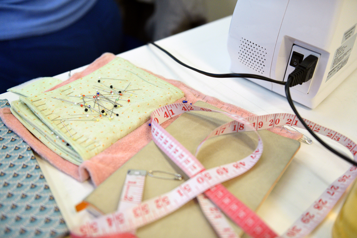 Les outils de la couturière : un mètre ruban, des épingles et… une machine à coudre !