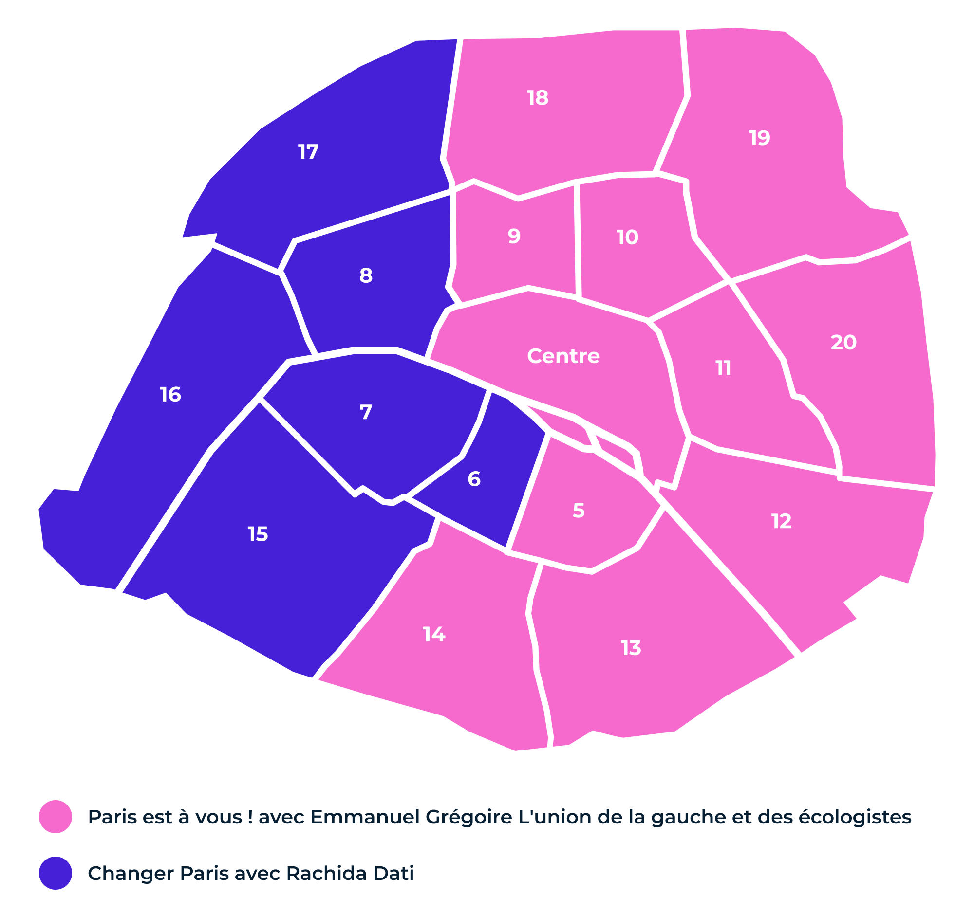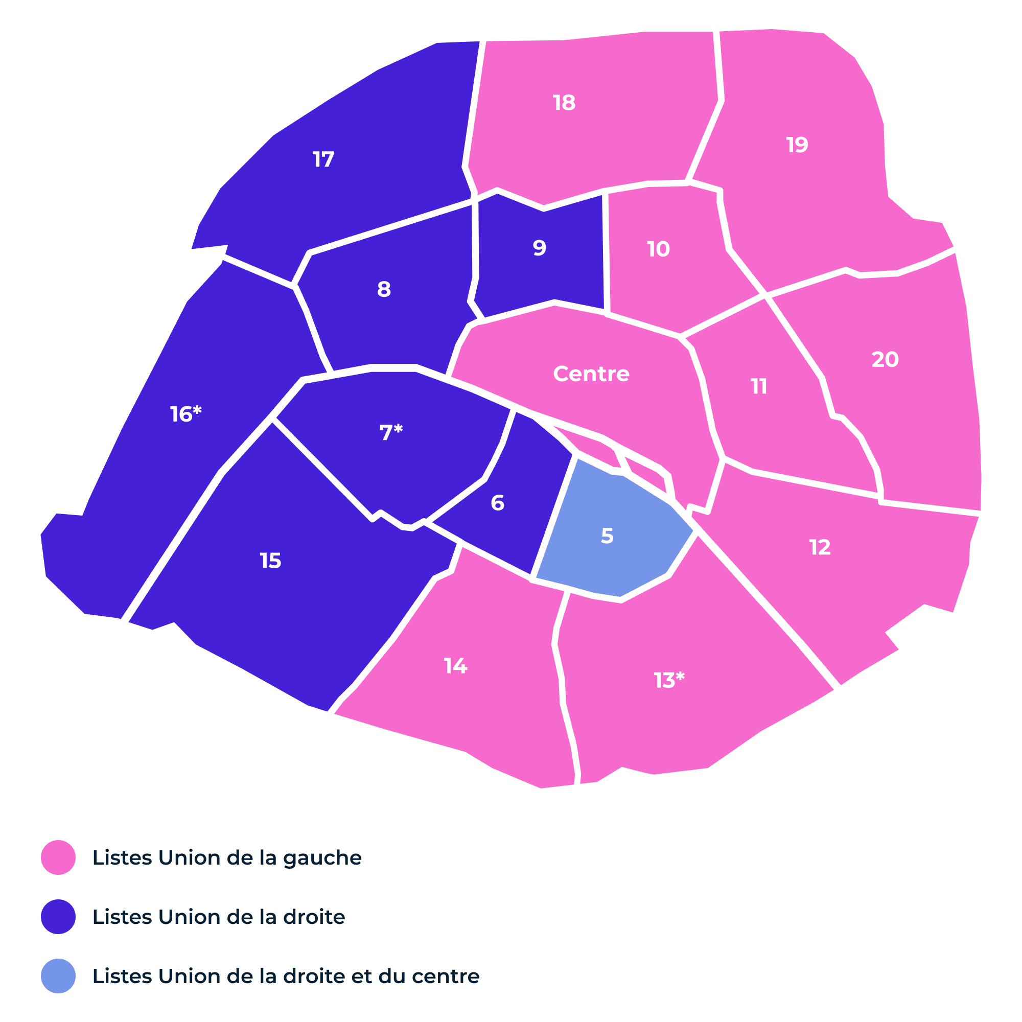 Les huit arrondissements déjà détenus par la droite et/ou le centre restent à droite, tandis que les neuf autres (Paris-Centre regroupant quatre arrondissements) demeurent à gauche. Parmi les nouveaux maires d'arrondissement, on peut citer Lucie Castets dans le 12e et l’écologiste David Belliard dans le 11e arrondissement.