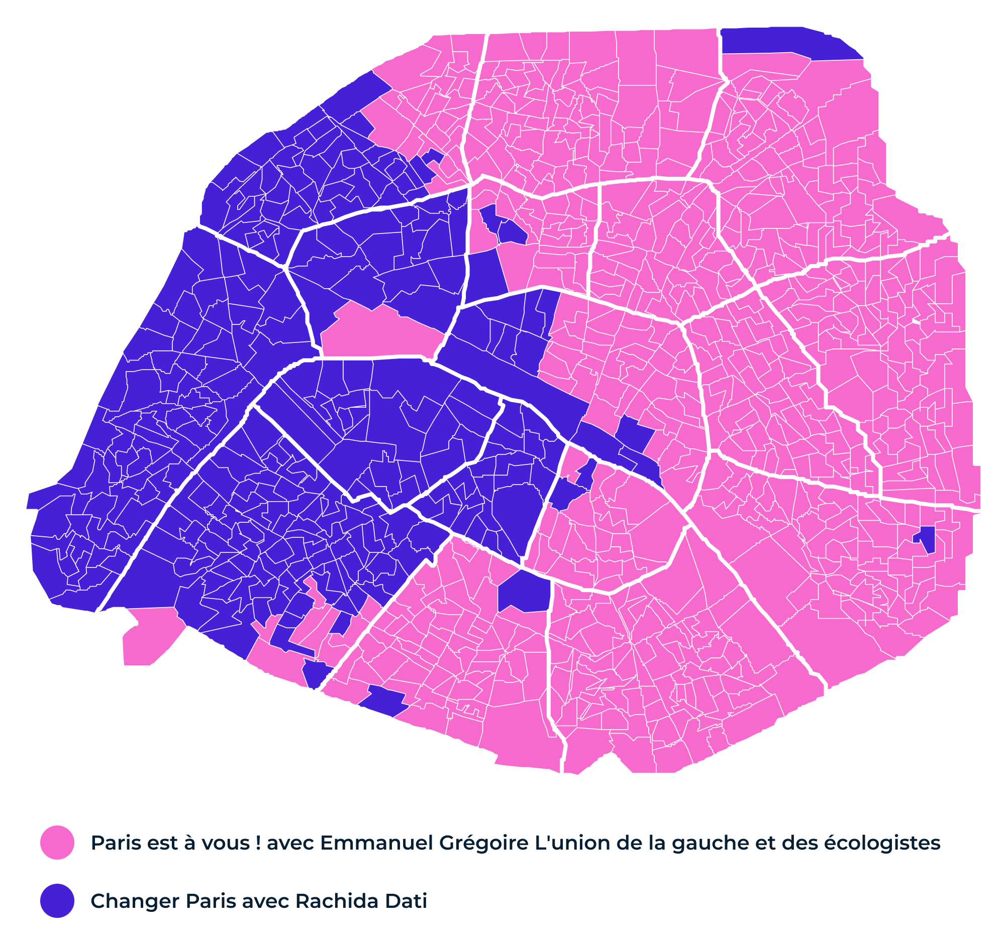 La liste d'Emmanuel Grégoire a récolté près de 430 000 voix, soit 50,52 % , contre plus de 300 000 au premier tour (37,98 %). Il progresse dans la totalité des bureaux de vote de la capitale, surtout dans les quartiers où il était déjà arrivé en tête.