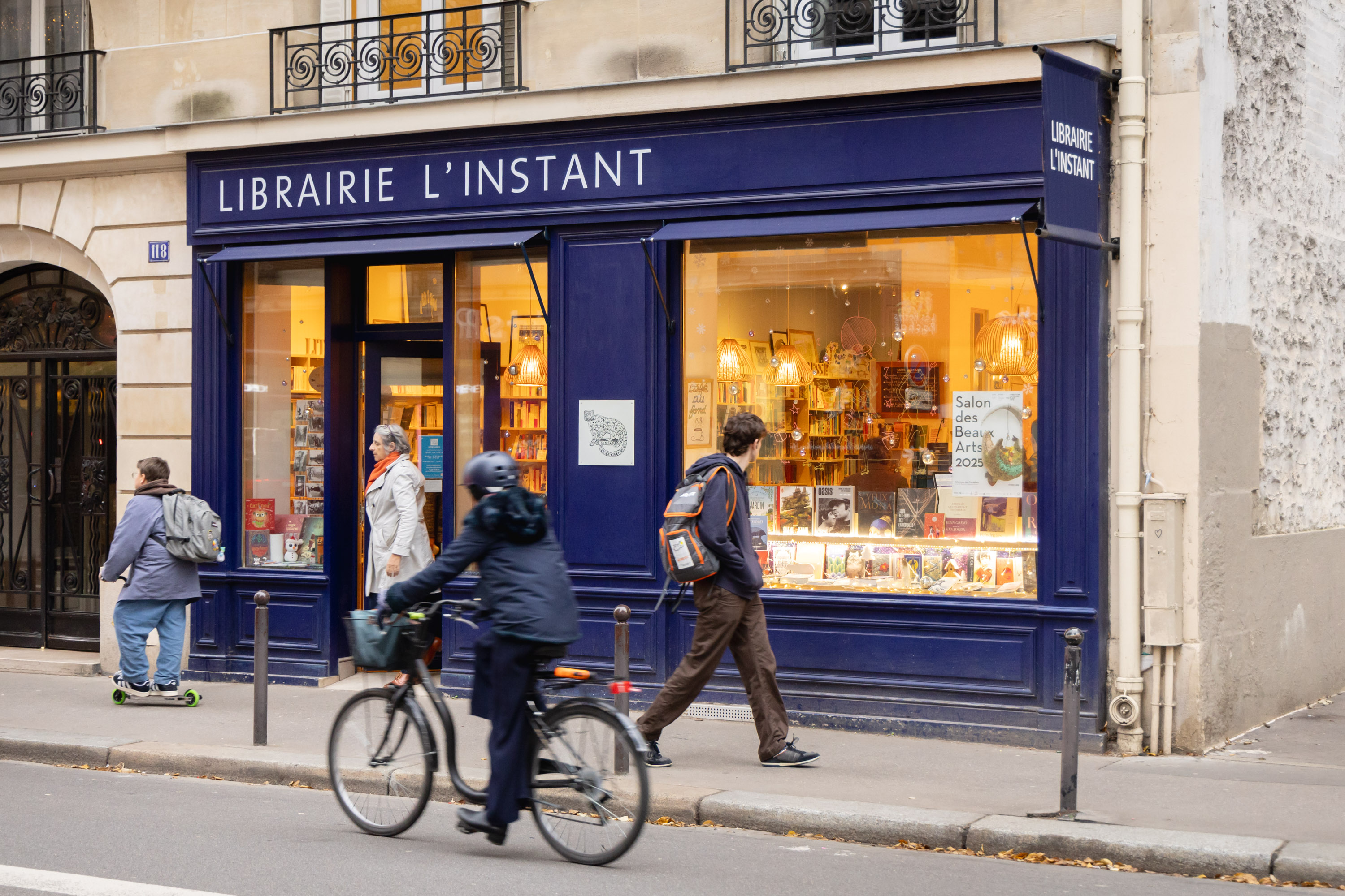 La jolie devanture bleue de la libraire L’Instant (15e).