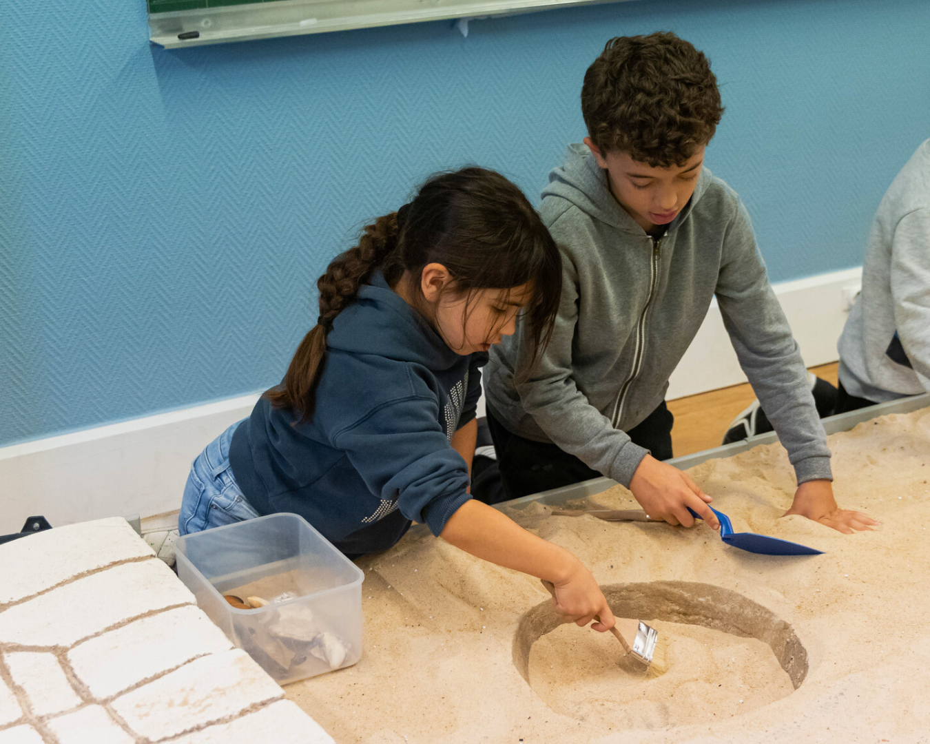 Chaque mercredi après-midi et sur les temps d'accueil périscolaires (TAP), les mardi et vendredi, une médiatrice reçoit des groupes autour d'un spectaculaire simulateur de fouilles. Ce dispositif immersif permet aux enfants de se glisser dans la peau de véritables archéologues : équipés d'outils, ils doivent dégager d'authentiques structures (fosses, maçonnerie, niveau de sol, sépulture) et découvrir des artefacts datant de la Préhistoire à nos jours.