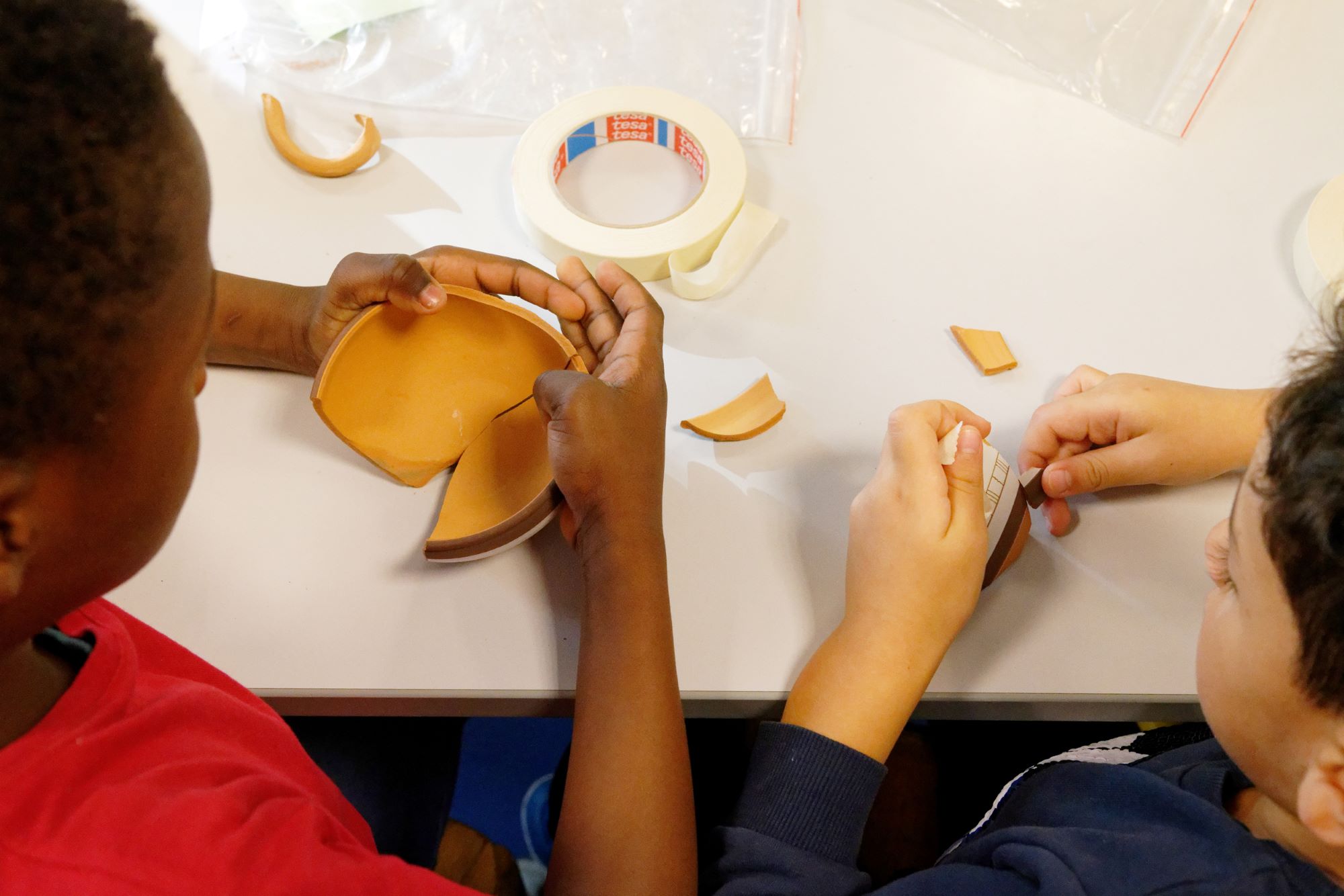 Deux enfants remontent une poterie à la manière d'un restaurateur.
