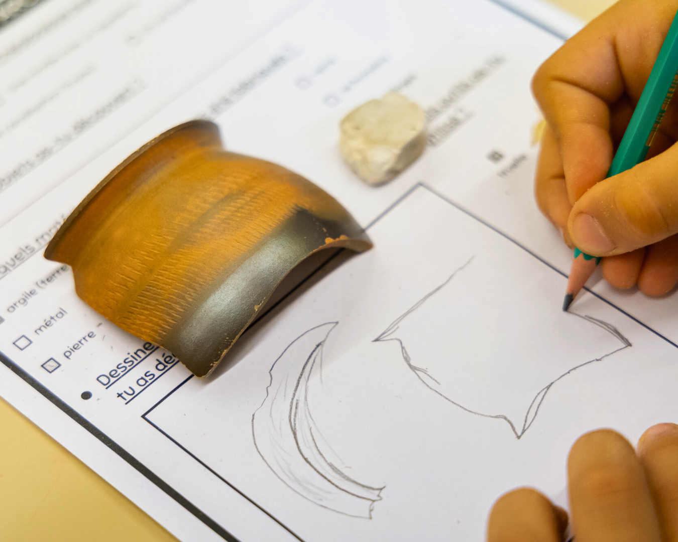 Atelier de médiation archéologique en classe : découverte des outils et des gestes de l'archéologue.