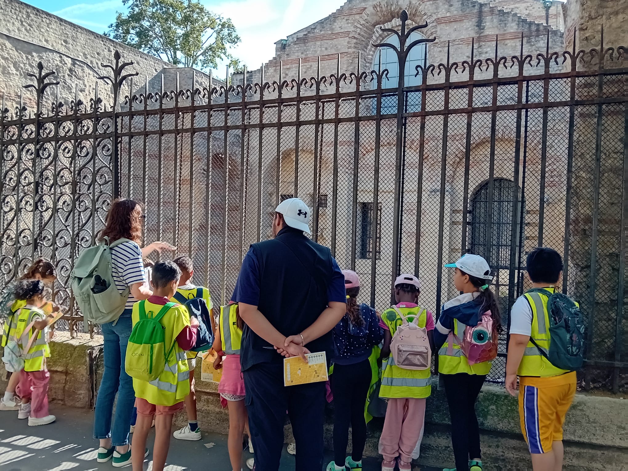 Un centre de loisirs participe à une randonnée découverte sur les traces des vestiges de Lutèce et fait étape devant les thermes antiques de Cluny.