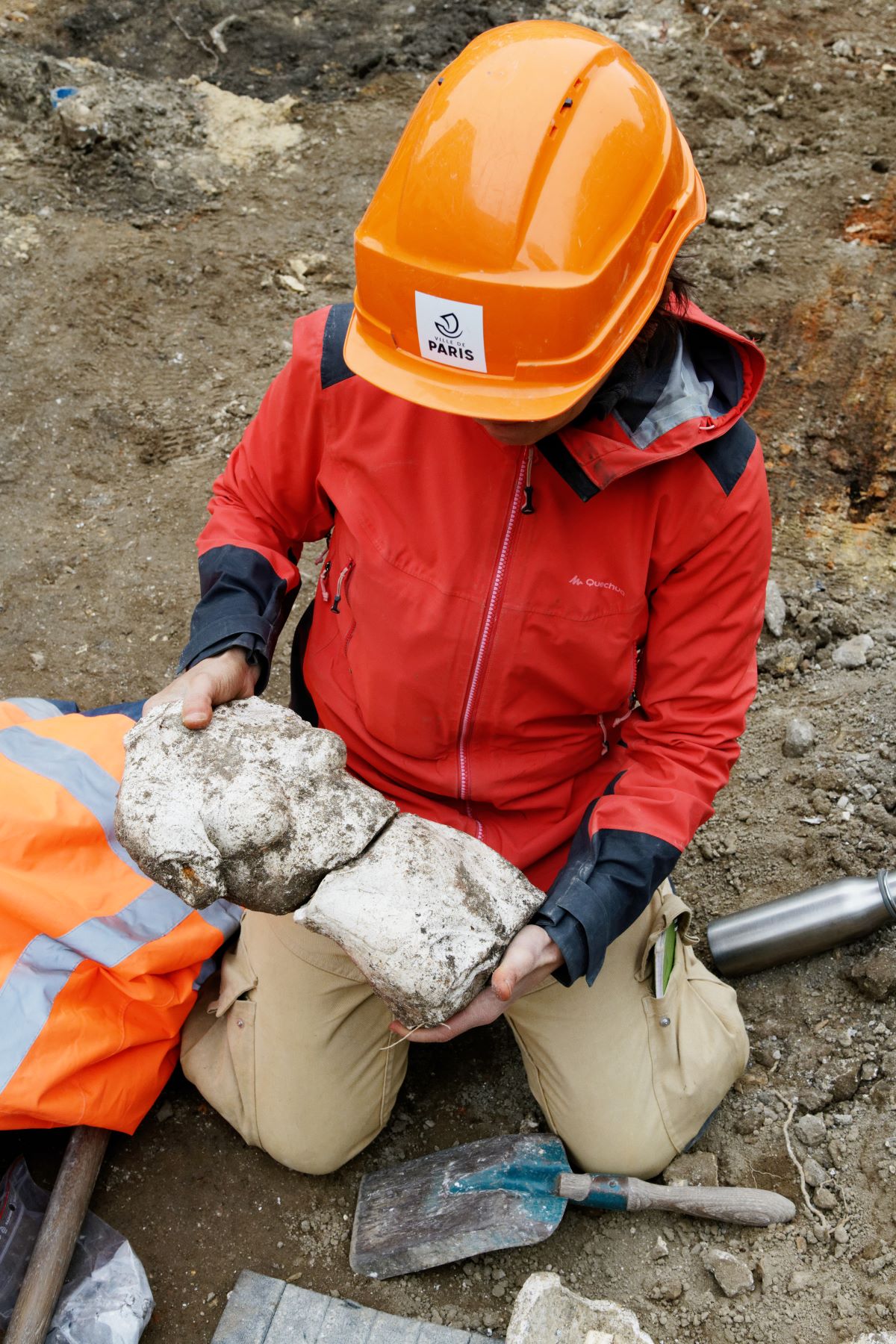 Découverte d'un buste en stuc appartenant probablement à une fontaine du XIXe siècle, lors d'une fouille menée à l'automne 2025 rue Gay-Lussac (5e).