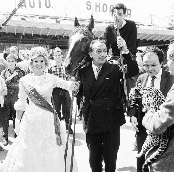 Salvador Dali promène sa dernière découverte, un petit ocelot (petit félin) qui ne le quitte plus. À ses cotes La Esmeralda 65, reine des forains et derrière lui Paco Ibanez sur son cheval noir. (14 mai 1965)