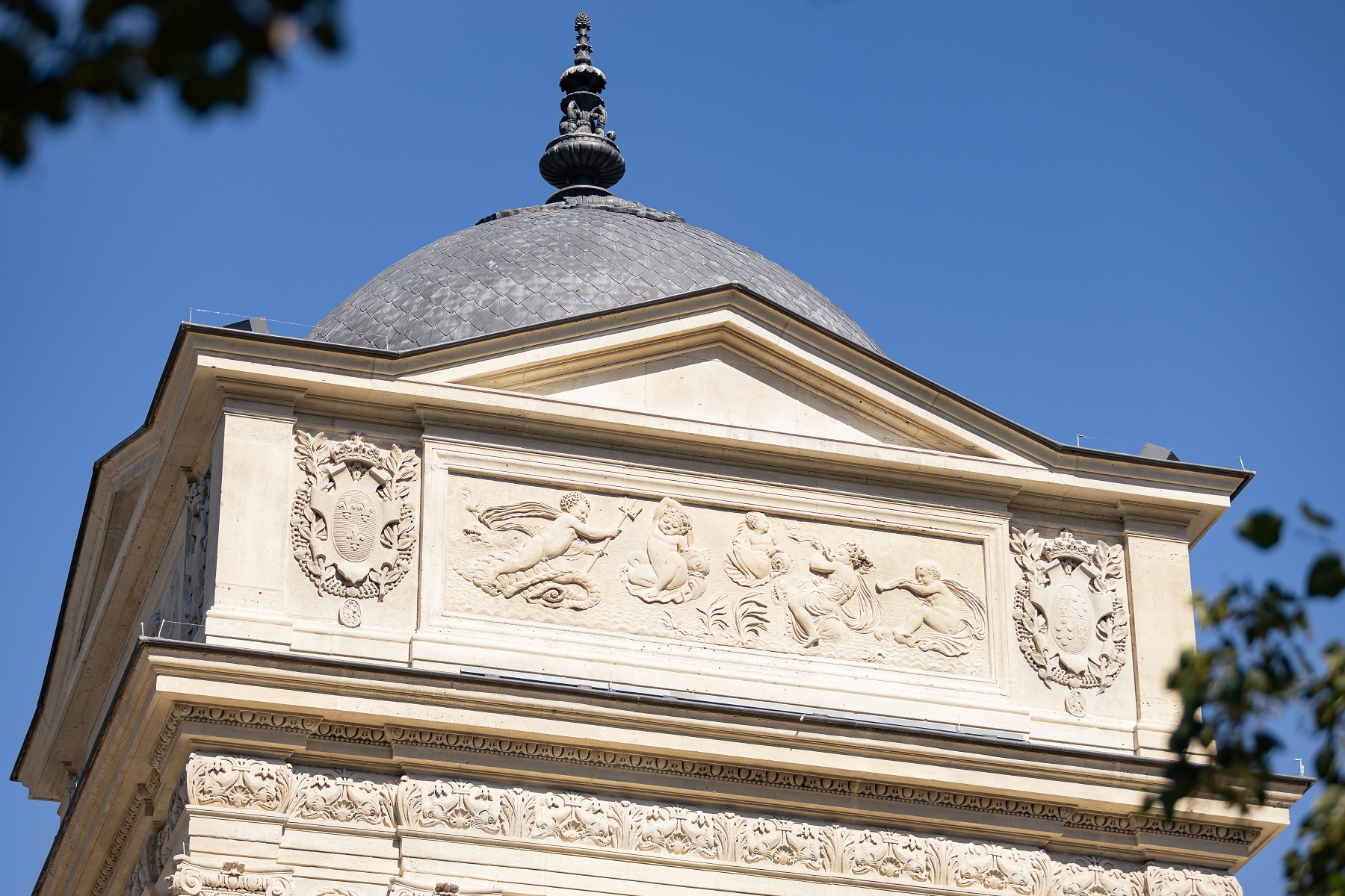 attique pourvu d’un bas-relief rendant hommage au monde marin : des petits génies rieurs évoluent parmi les coquillages et les dauphins.
