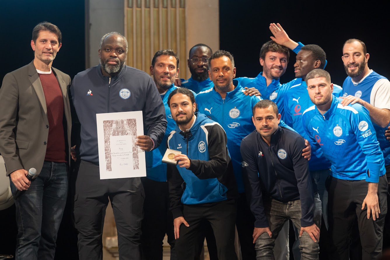 Equipe masculine du CSSM Paris Football et Pierre Rabadan adjoint à la Maire de Paris chargé des sports.