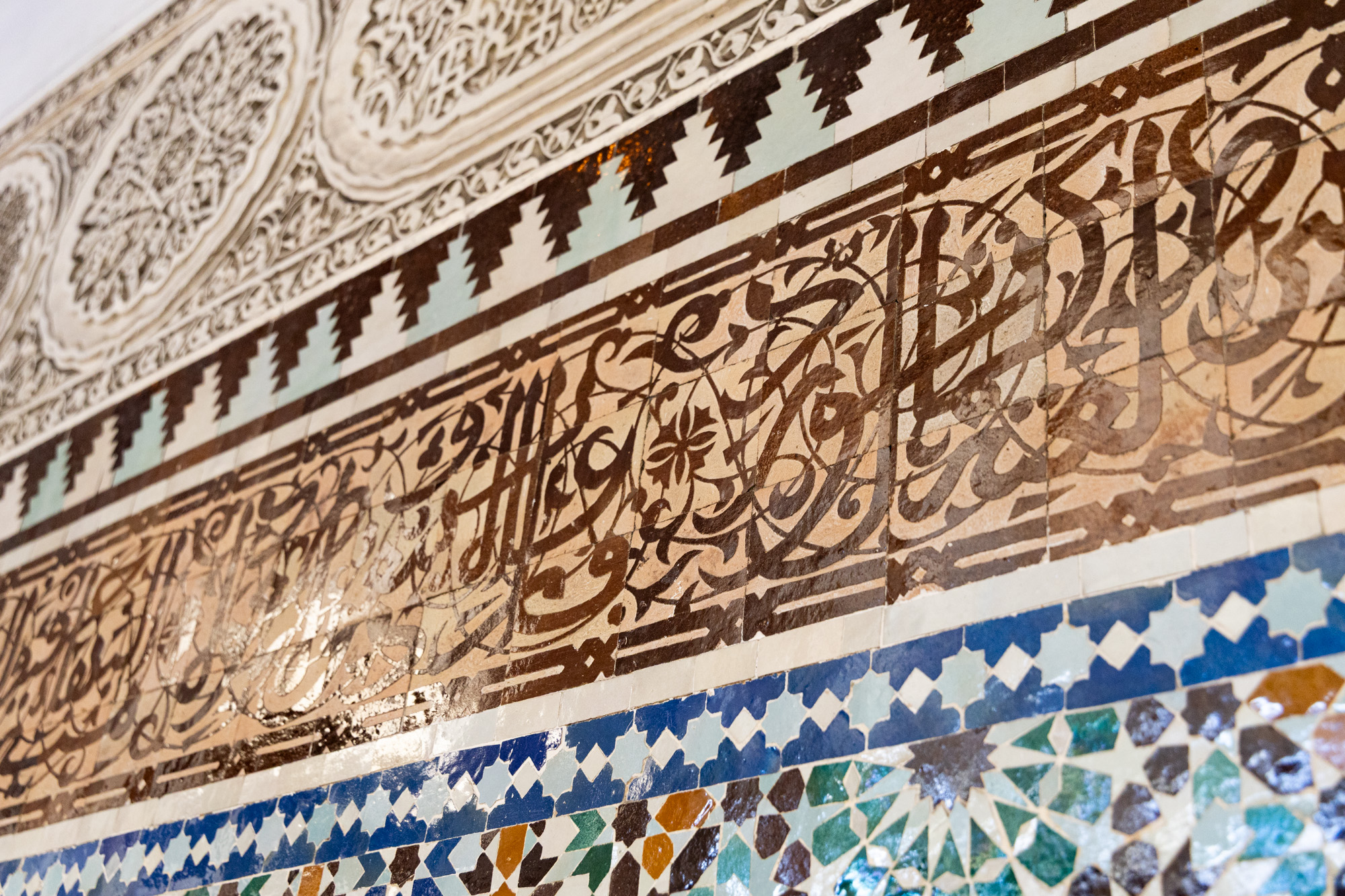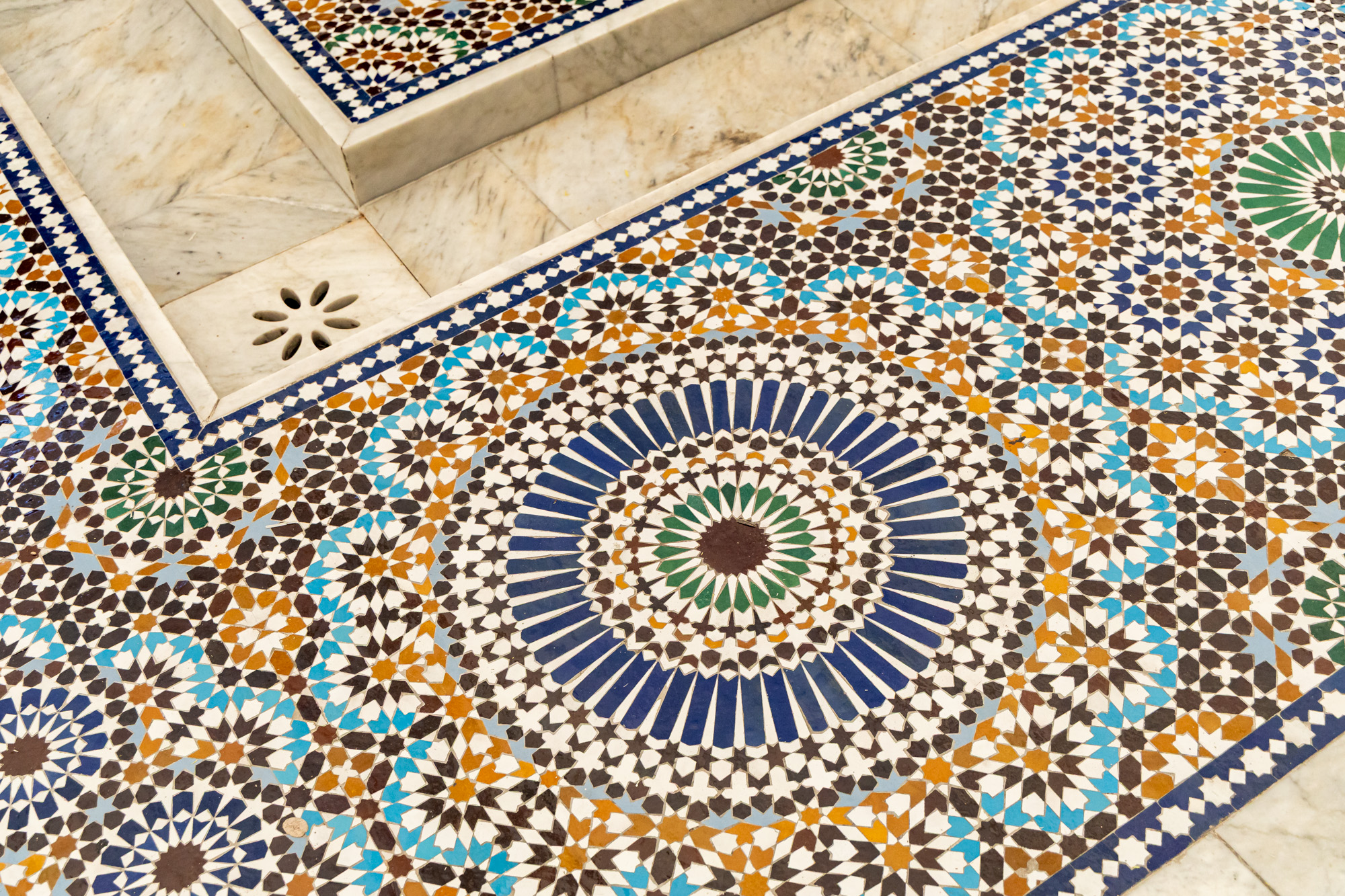 marquants du site : les zelliges – ces mosaïques de faïence géométriques et colorées – fabriqués par des artisans marocains de Fès