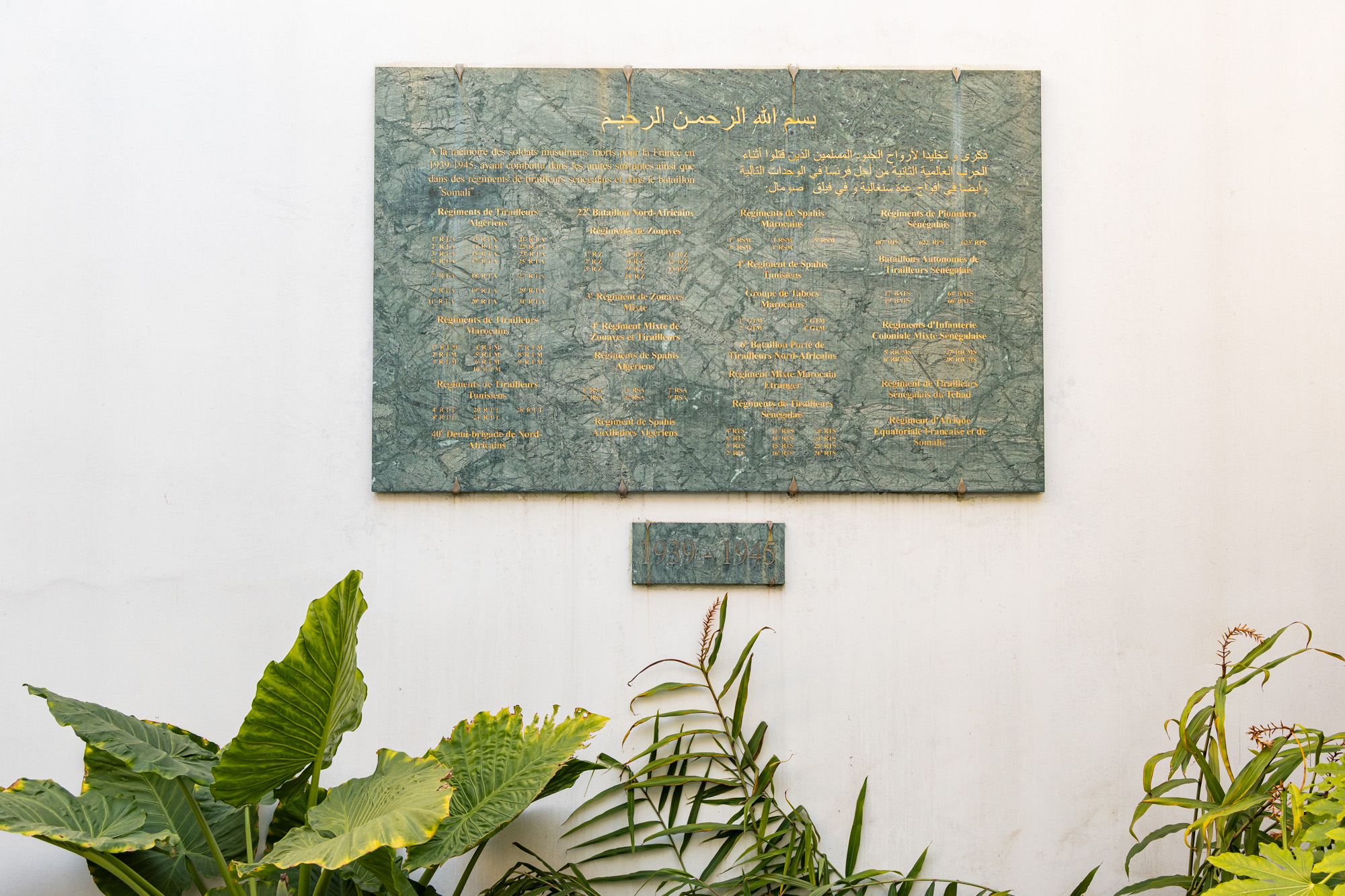 Plaque commémorant la mémoire des soldats musulmans morts pour la France lors de la Grande Guerre, dans la cour intérieure de la Grande Mosquée de Paris (5e).