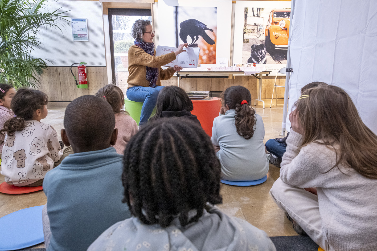 Un peu plus loin, des enfants écoutent les histoires d'animaux lues par une bibliothécaire.