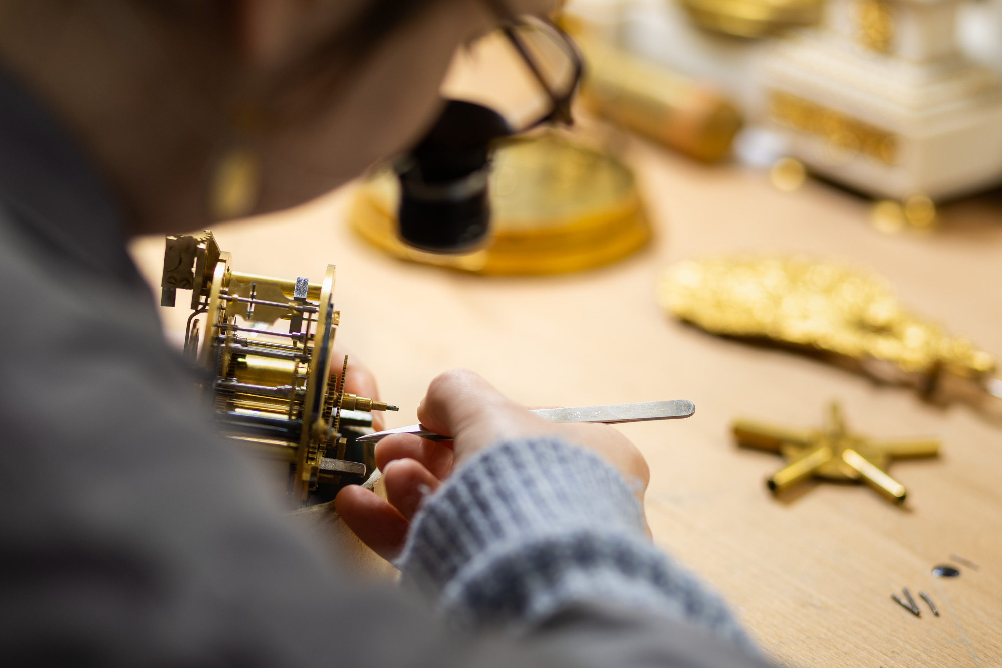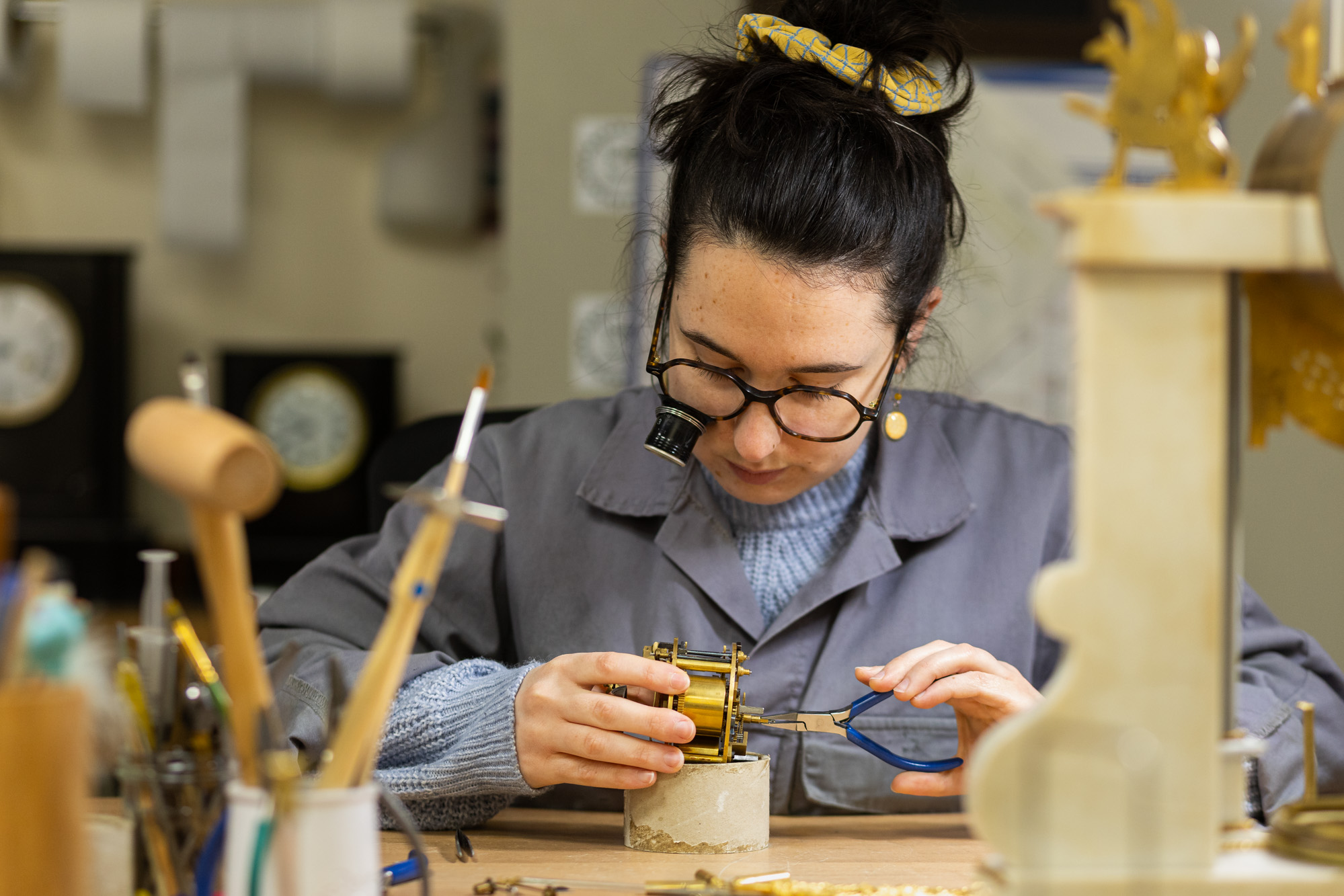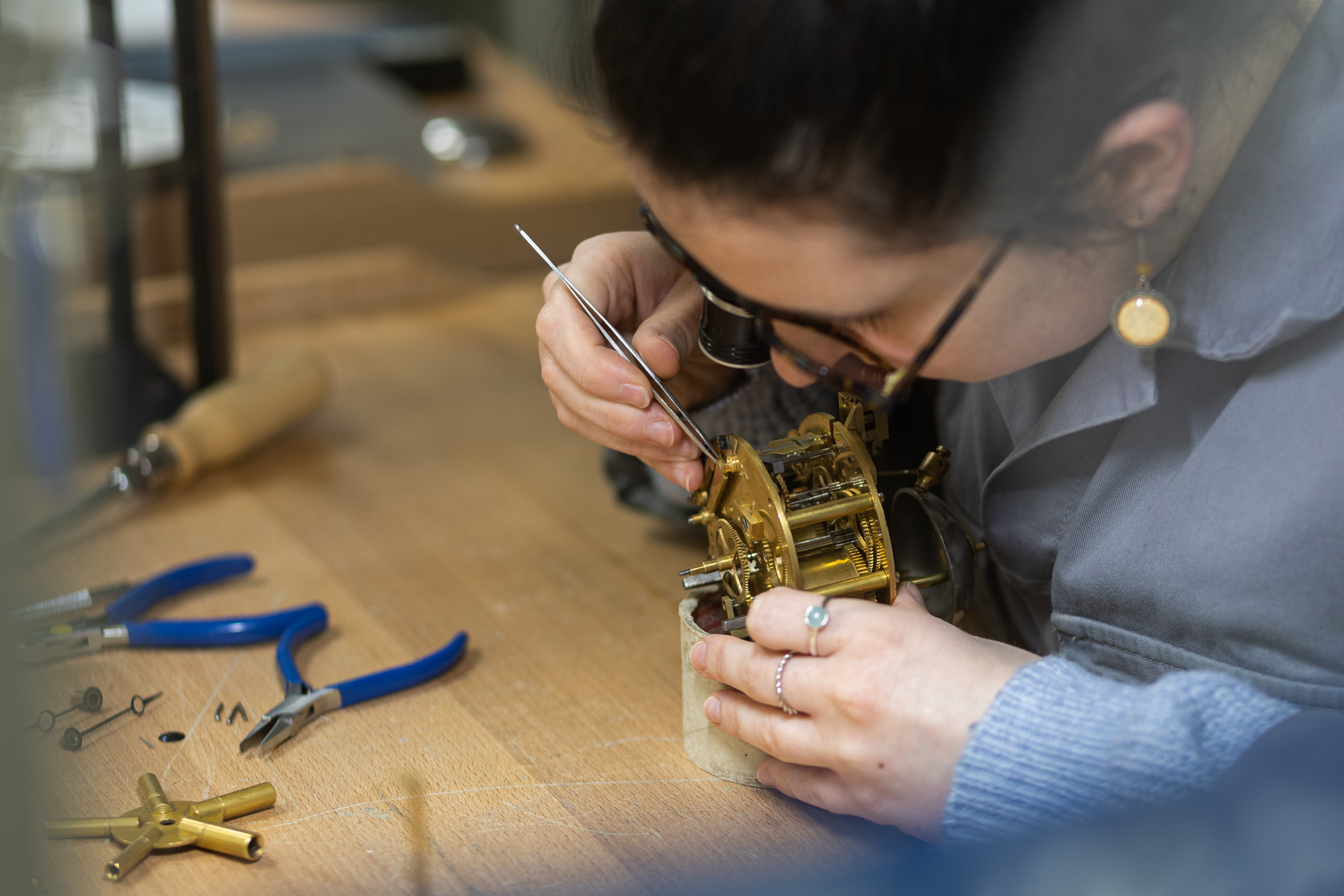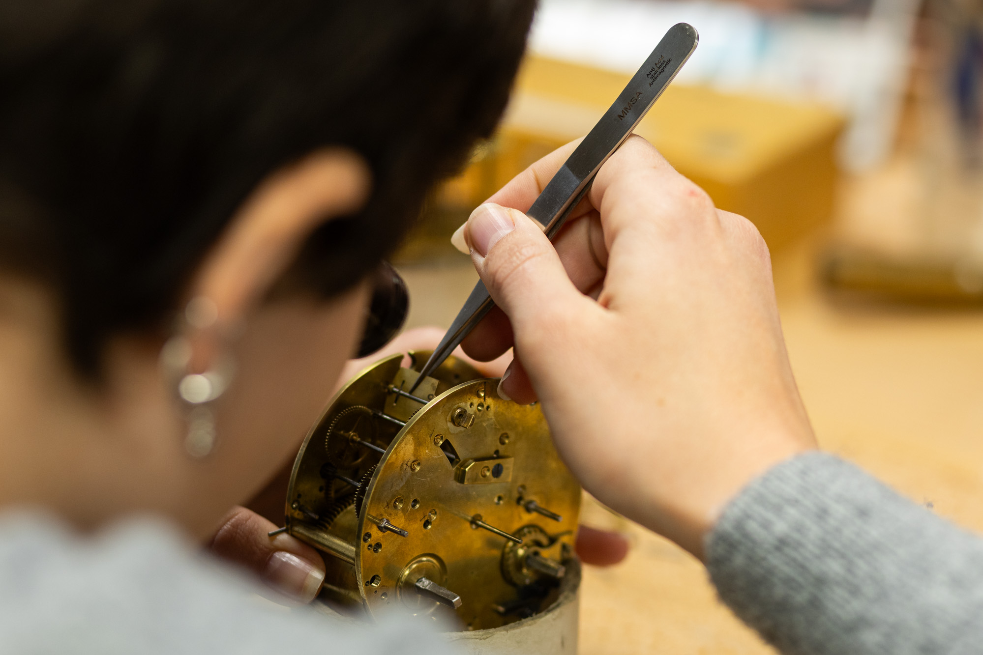 Avec patience et dextérité, Laurine Lottin cherche à comprendre pourquoi cette horloge ne fonctionne plus.