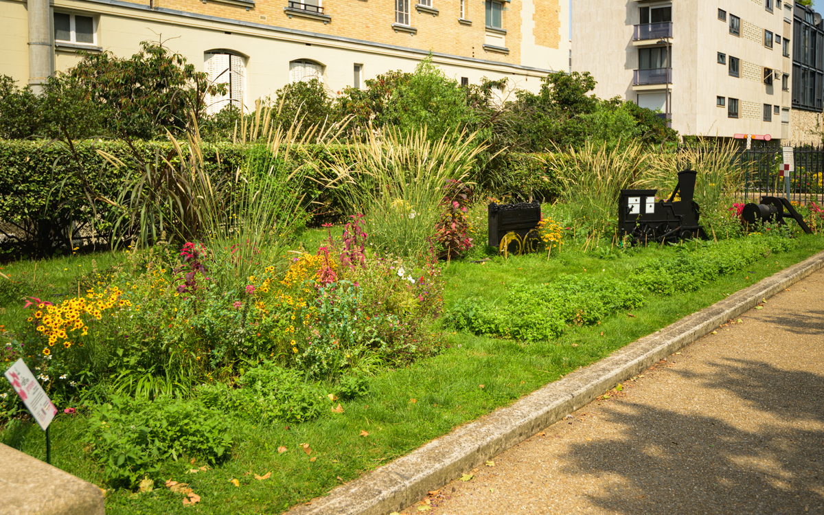 Décoration florale du square Jan Doornik, 16e, pour le concours Le Défi des jardiniers, édition 2025 sur le thème "La nature dompte la ville".