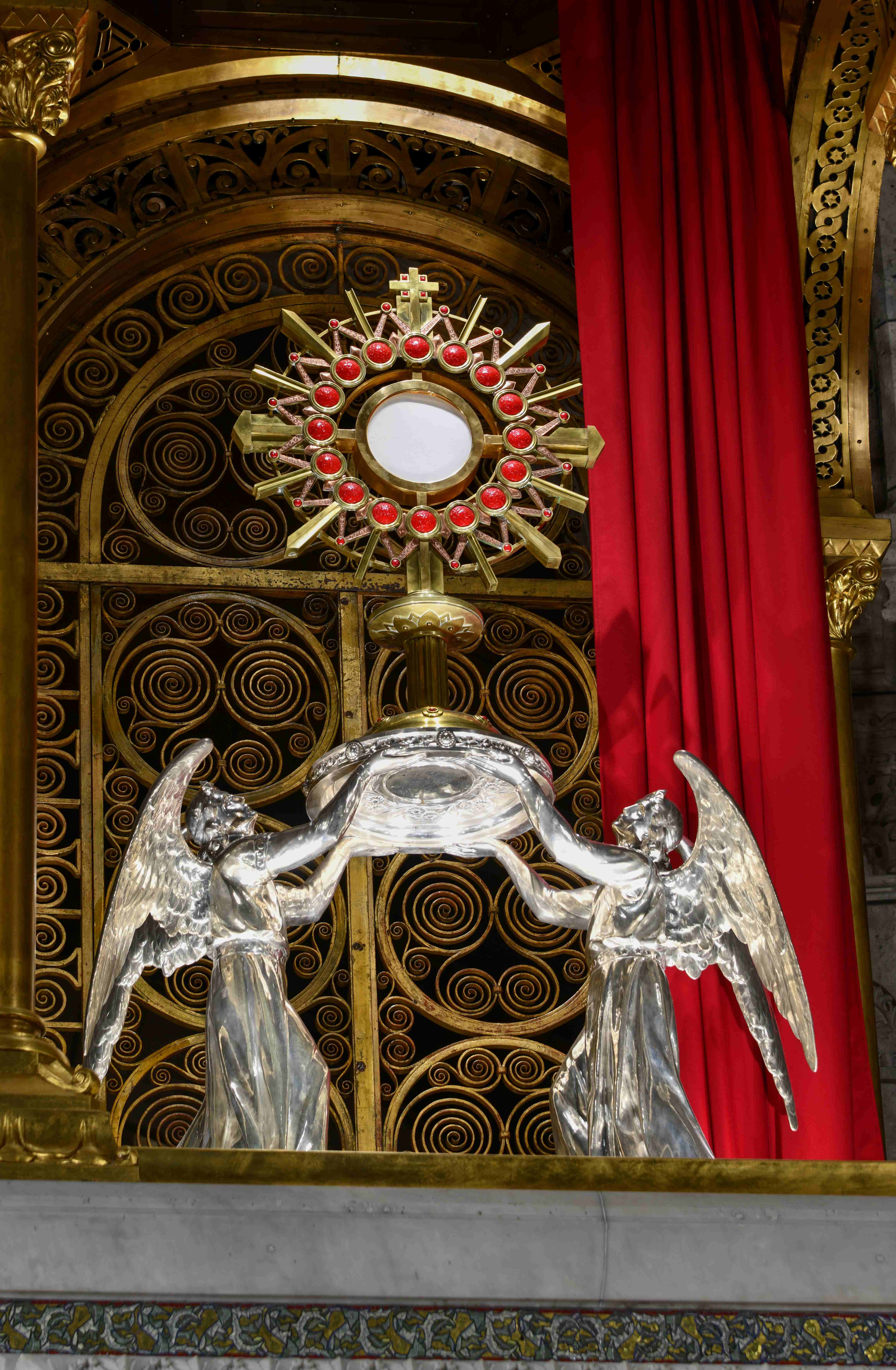 maître-autel, l’ostensoir supporté par des anges, les pique-cierges, le ciborium,