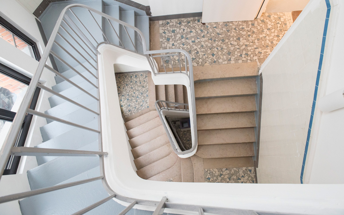 Dans l'ancien bâtiment des bains-douches, l'escalier d’origine avec sols en grès et céramiques.