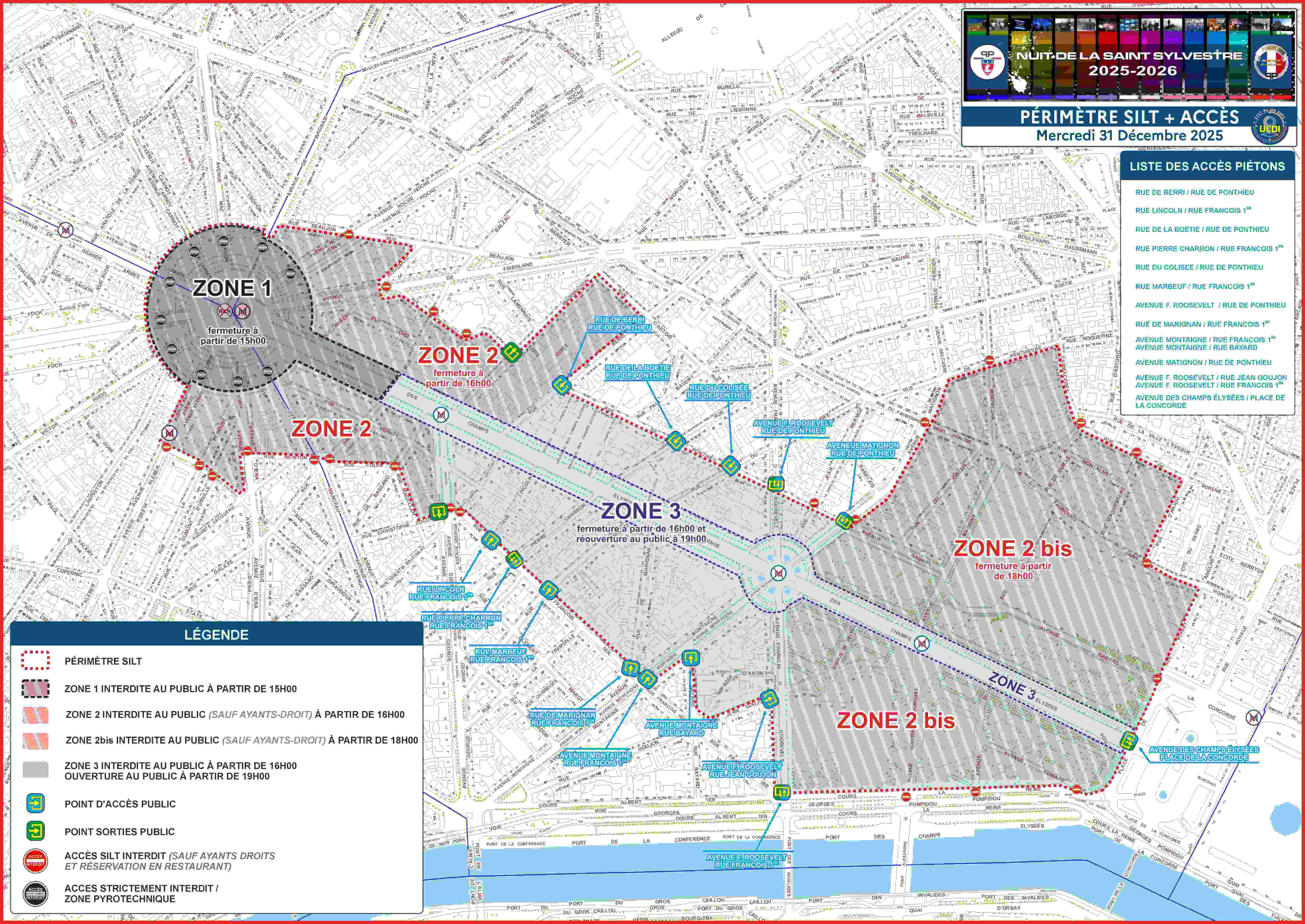 La circulation de tout type de véhicule est interdite du 31 décembre 2025 à 15h00 au 1er janvier à 04h00, au sein du périmètre délimité par les voies et portions de voies suivantes à Paris 8e, 16e et 17e, qui restent ouvertes à la circulation :