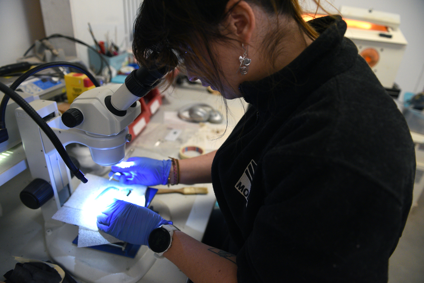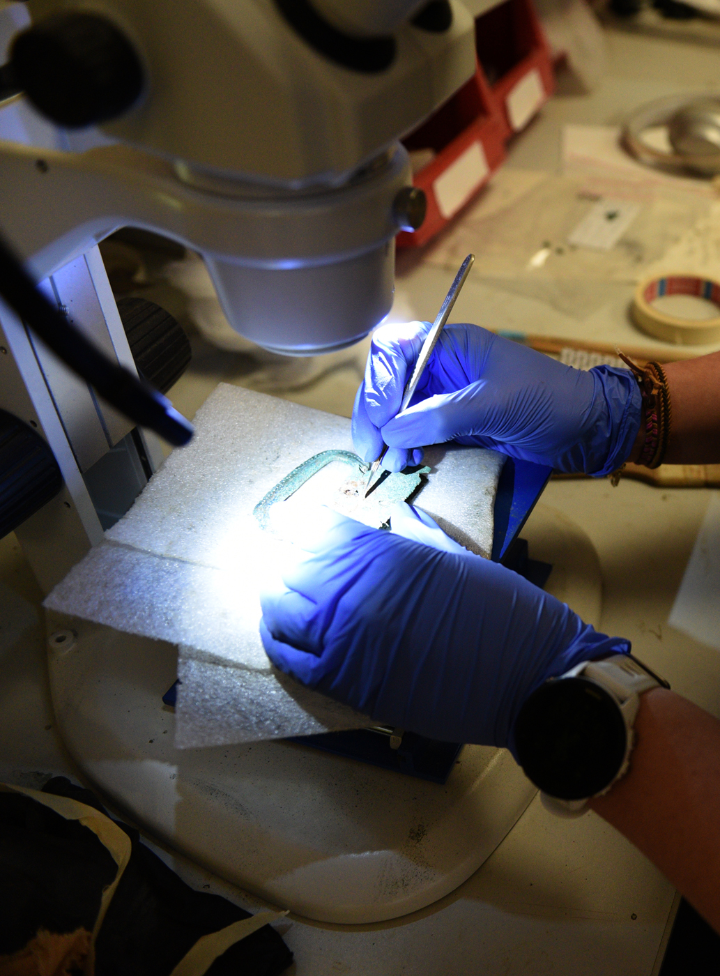 Dans son laboratoire, Lucie scrute au microscope une boucle de ceinture gallo-romaine.