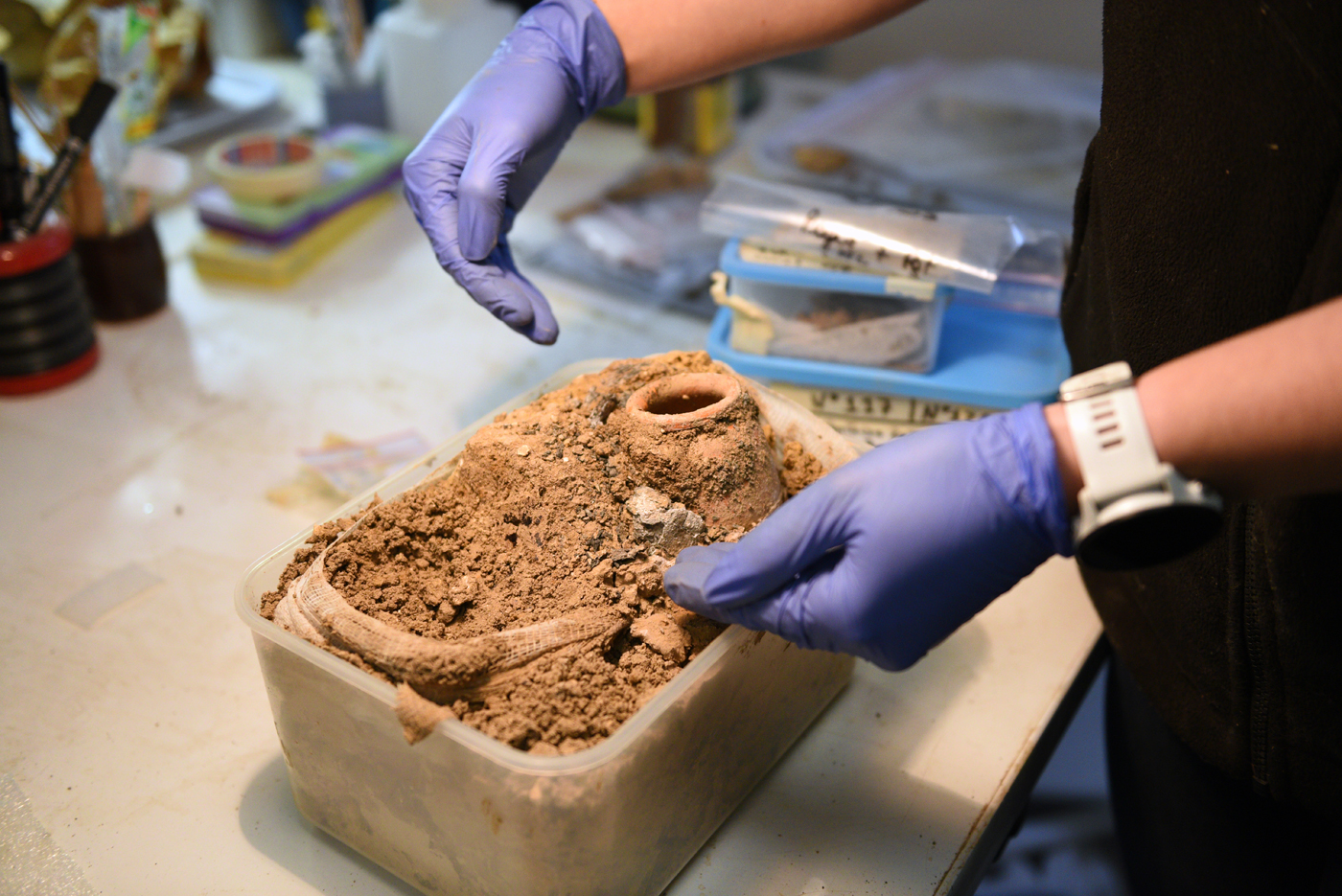 Lucie part souvent d’une motte de terre récupérée sur site pour terminer la fouille au laboratoire.