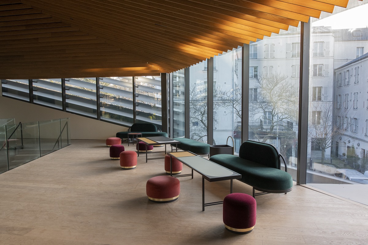 Une fois passée l’entrée, le vocabulaire architectural change, avec un jeu d’écrans, de résilles de lattes de pin et d’aluminium, de passerelles qui rythment la façade intérieure et la relie au jardin. Dans les murs, chaque ouverture est un cadrage. Le regard traverse les hautes parois vitrées et se plonge déjà dans la prairie douce du jardin anglais. Des lignes longitudinales dynamiques se répondent, des lattes du plancher aux gradins, jusqu’au plafond à lamelles de bois infinies, renforcées par des effets miroir.