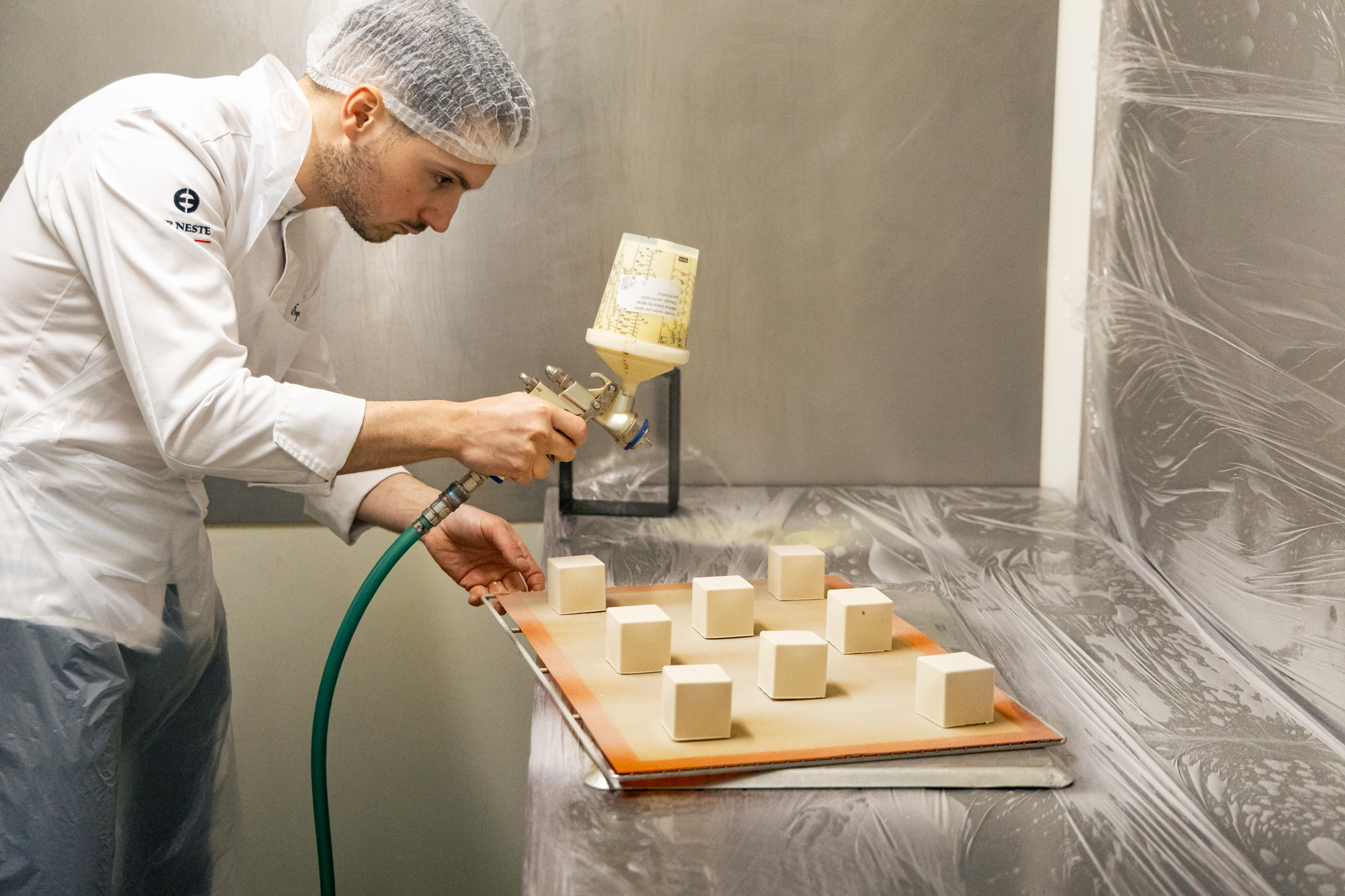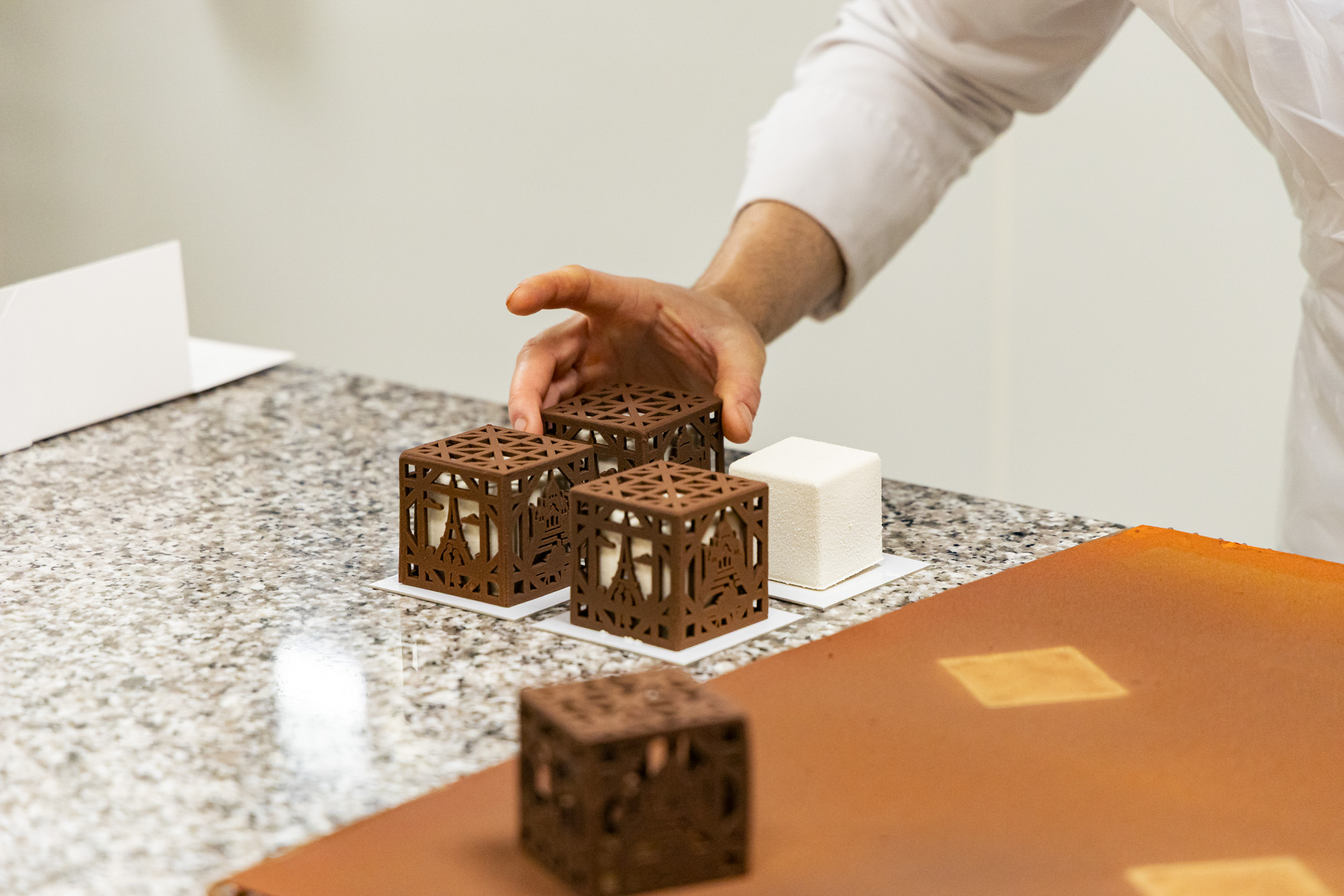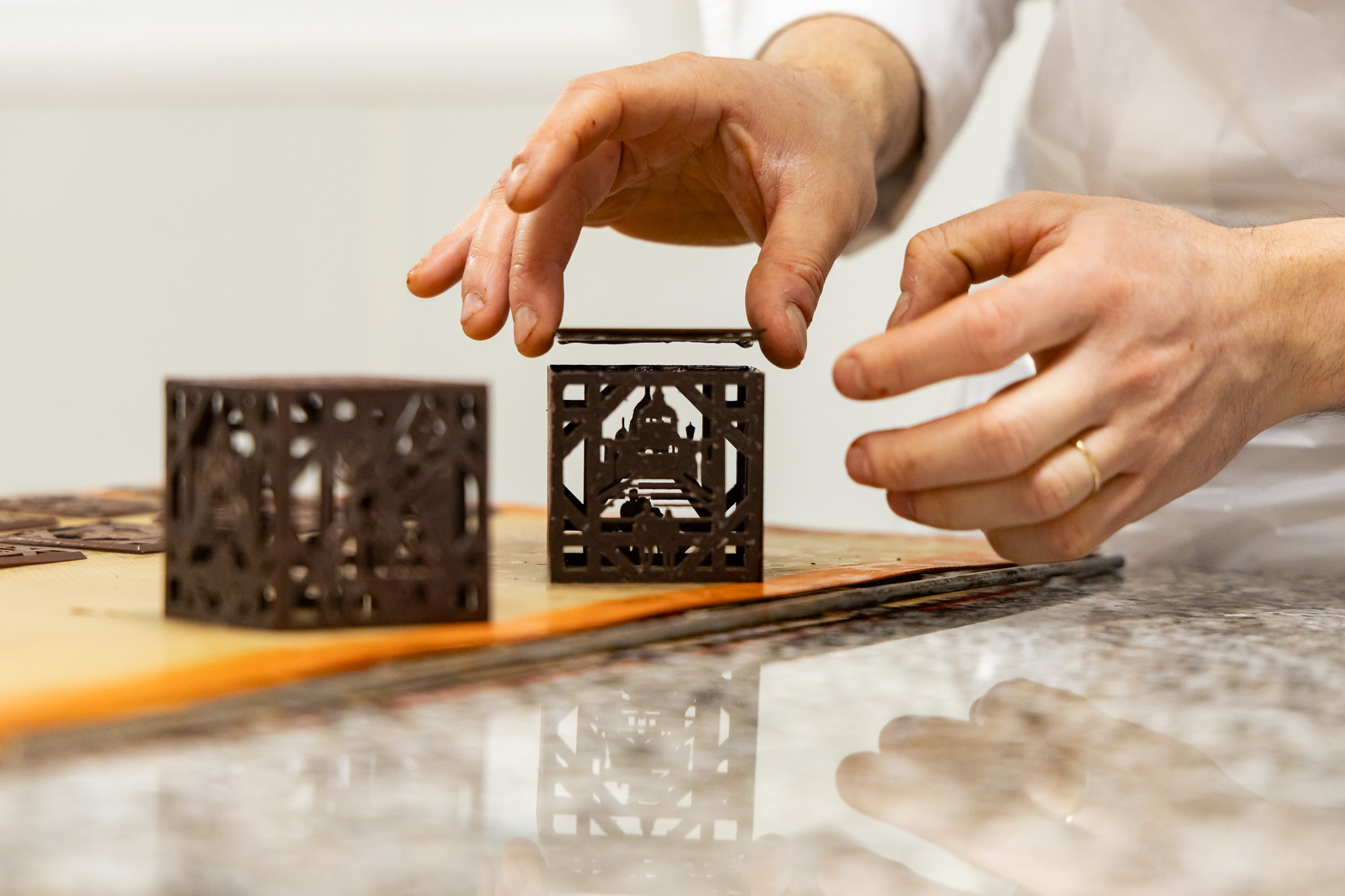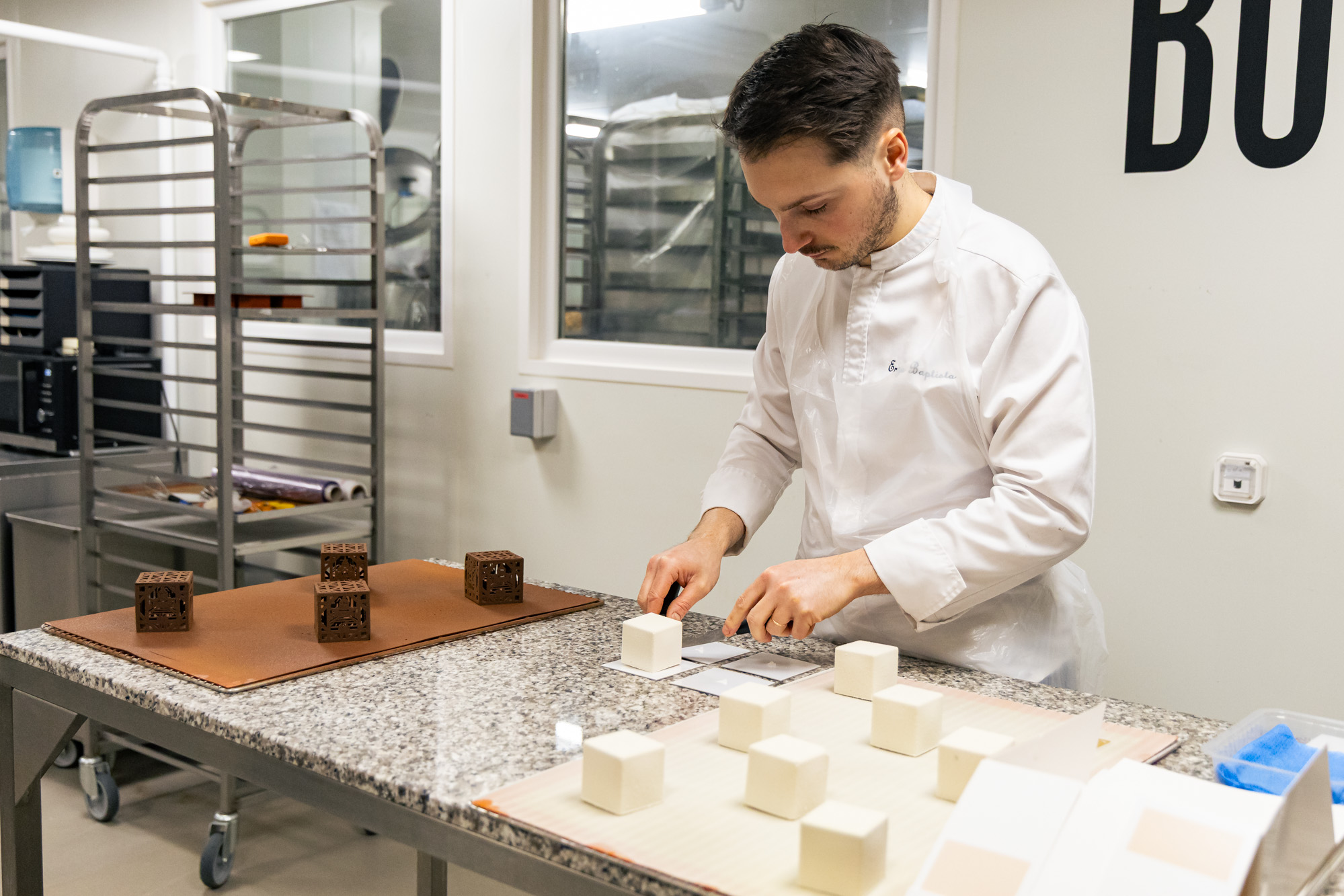 C’est le moment d’intégrer chaque entremets dans chaque cube chocolaté, une autre opération délicate.