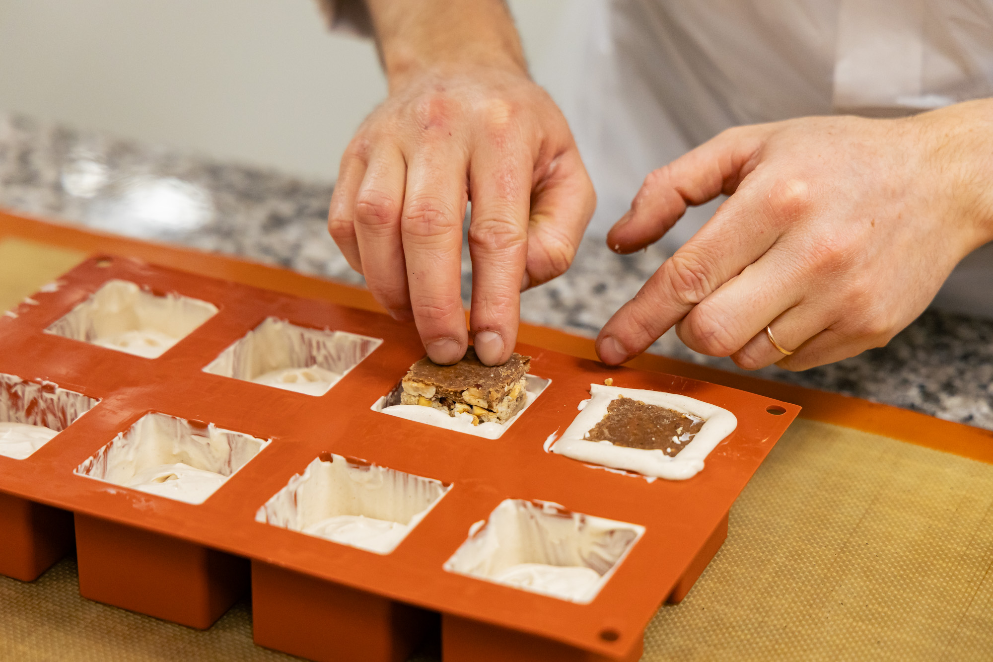 Une fois délicatement introduits dans les moules, les inserts sont lissés avec un complément de mousse. La préparation est alors mise au congélateur pour qu’elle prenne.