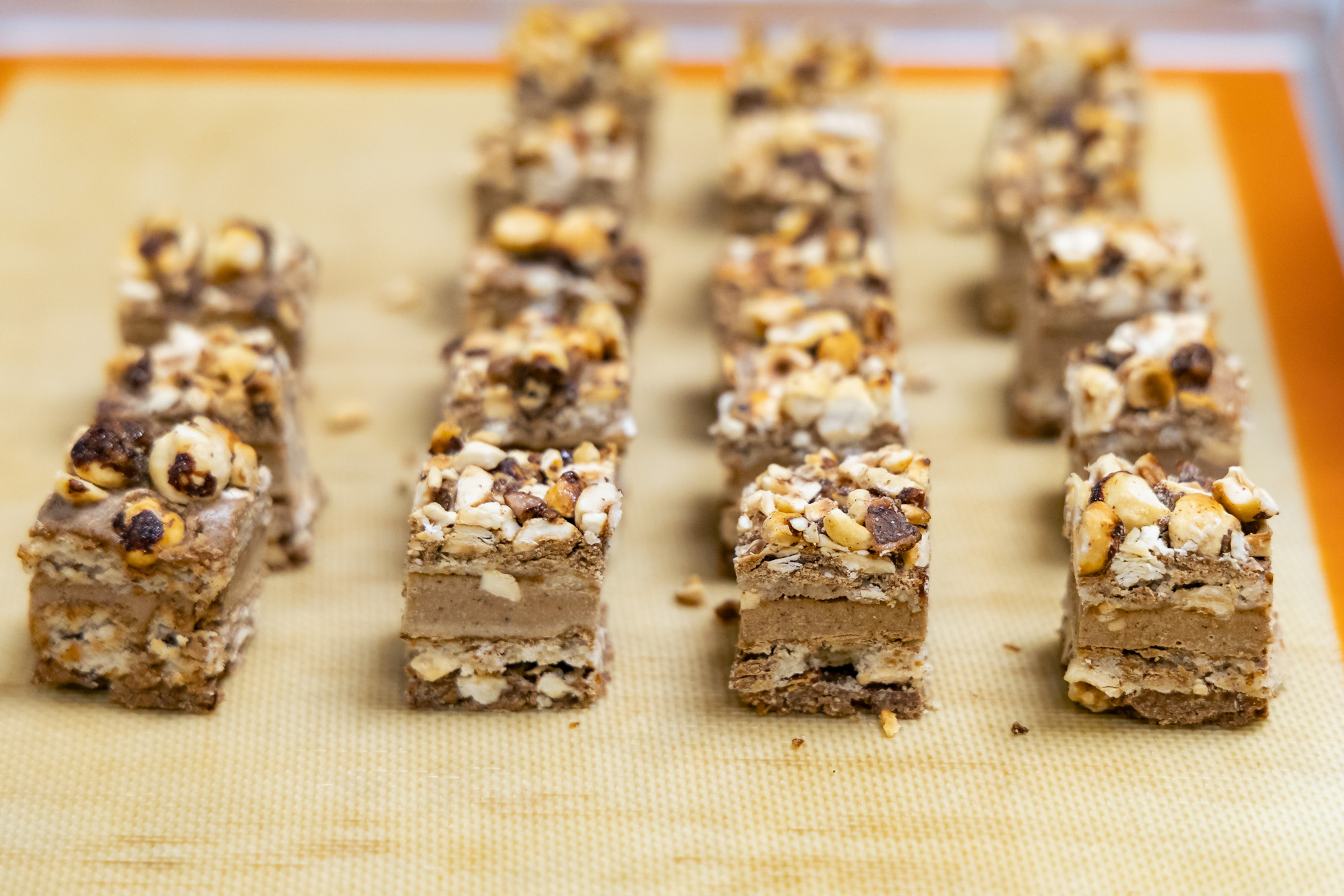 Sur les différentes couches de l’insert, Enzo ajoute un croustillant orné de noisettes caramélisées et refroidies.
