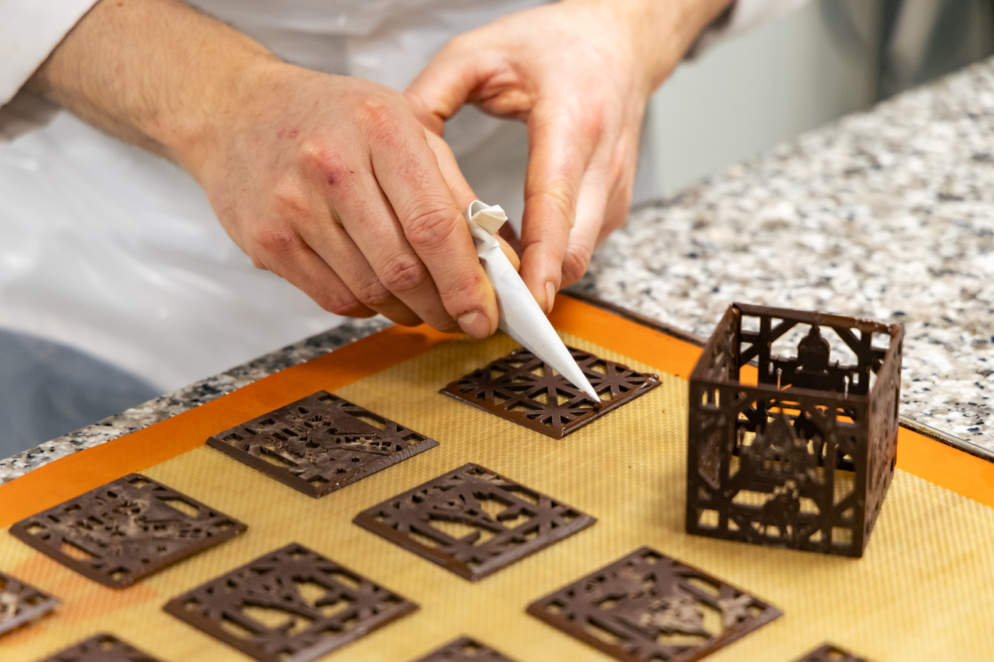 Pour assembler les faces, Enzo les prépare sur un support chaud pour qu’elles puissent coller les unes aux autres. Il ajoute du chocolat fondu pour les faire adhérer entre elles.