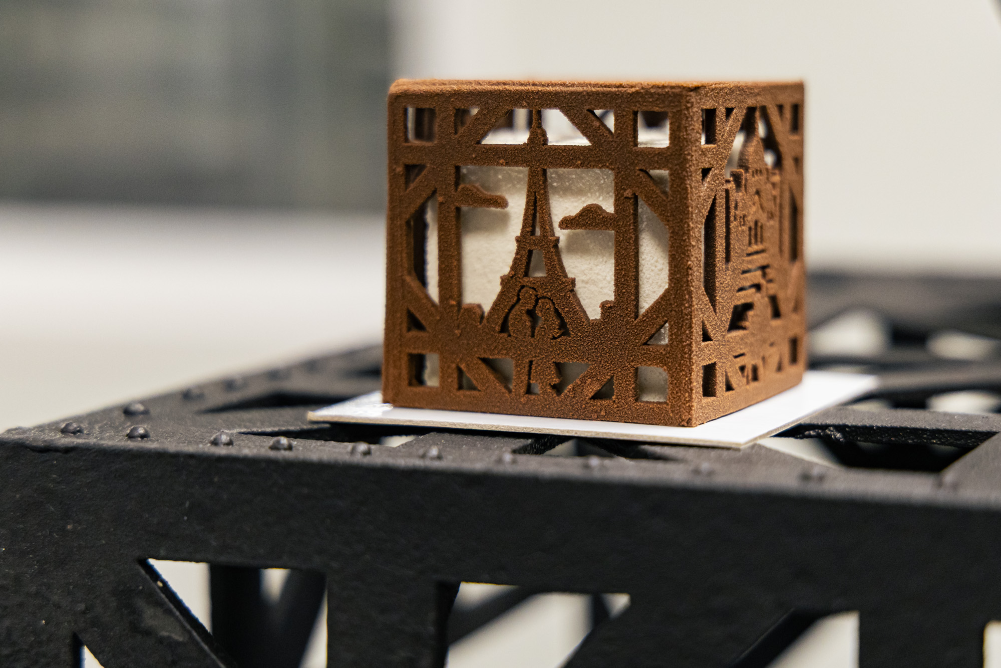 Chaque face représente un monument romantique : la tour Eiffel pour l’amour éternel, Montmartre pour l’amour religieux, le pont des Arts pour l’amour scellé et le Moulin-Rouge pour l’amour extraverti.