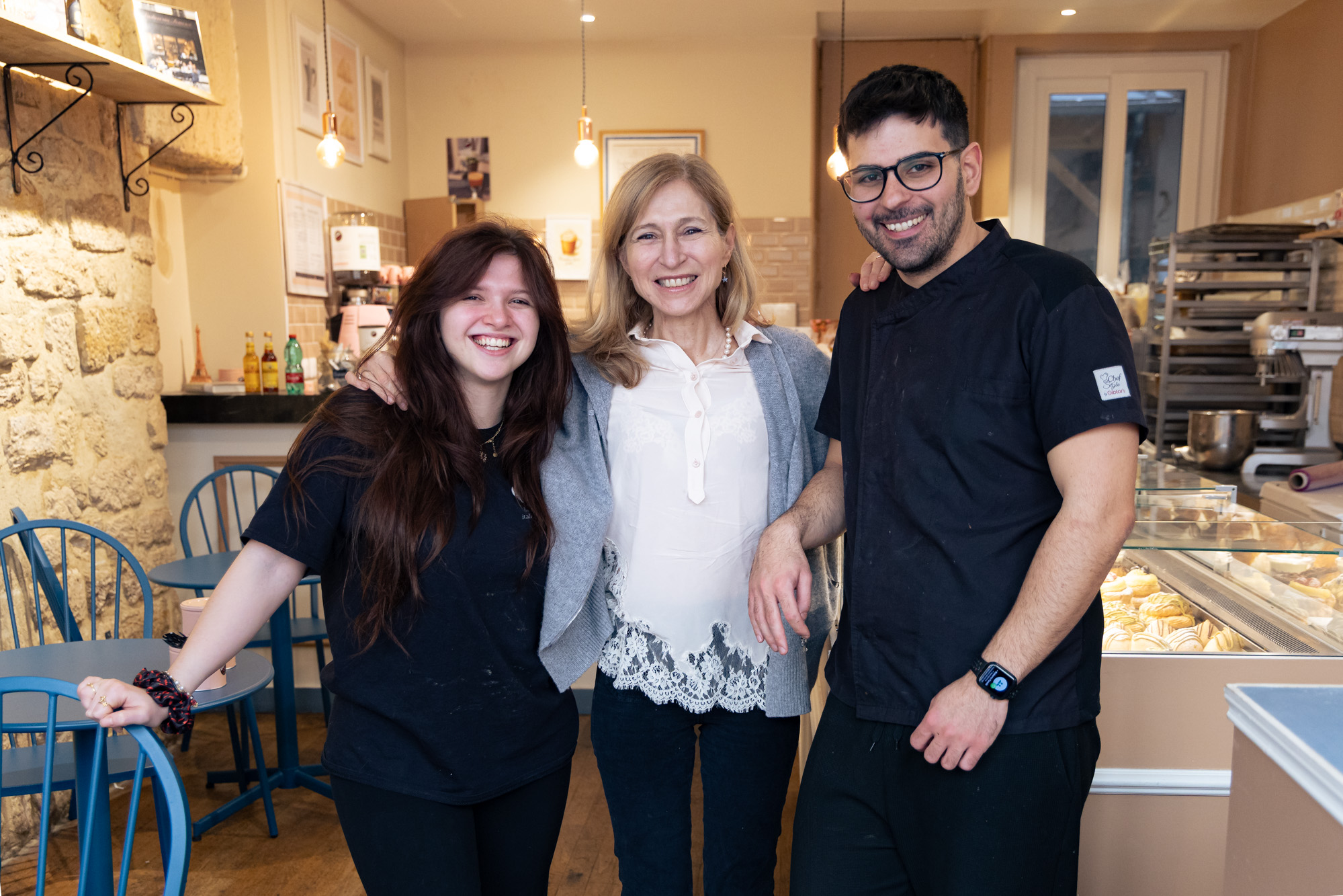 Avant de passer les commandes à Vincenzo le chef, et à Charlotte, sa fille, Simona pose avec eux dans sa jolie pâtisserie.