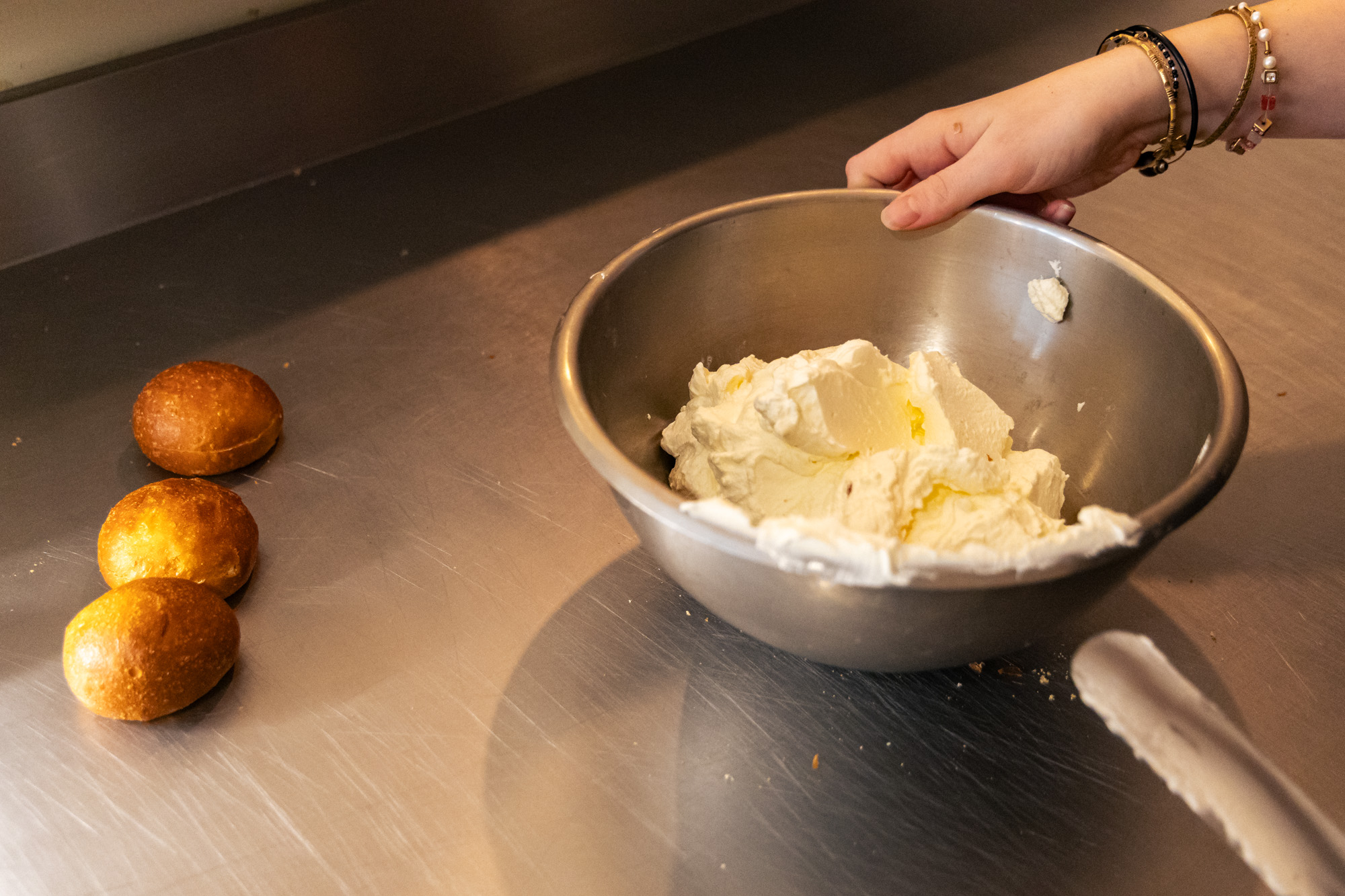 Charlotte se charge de les garnir avec un mélange de crème fraîche, de sucre et d'un cœur de vanille.